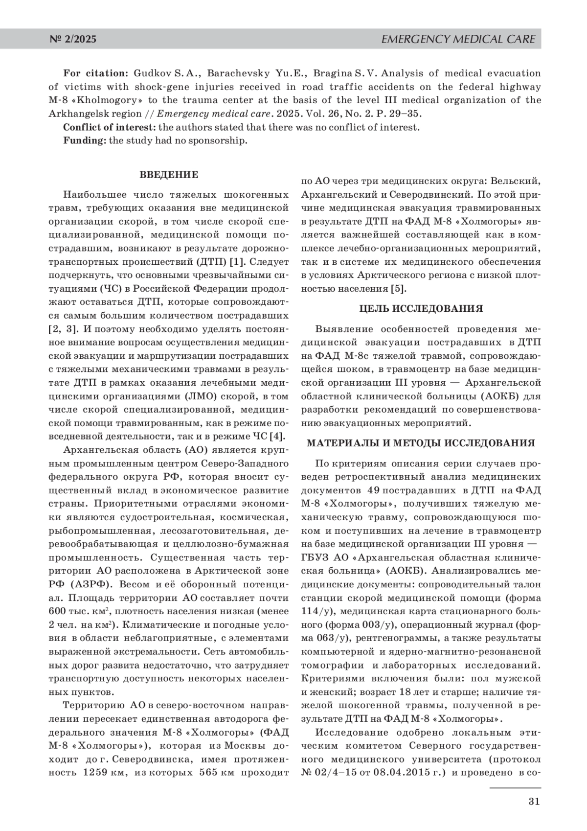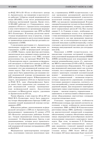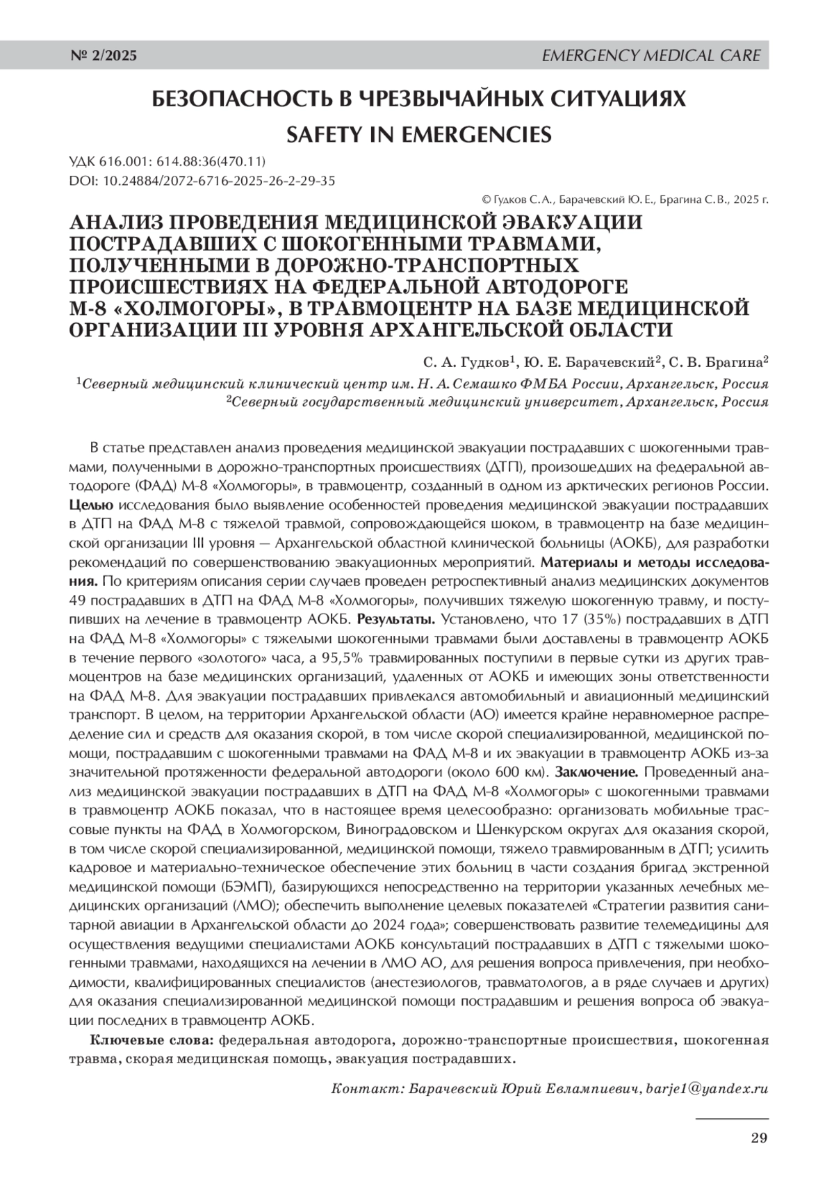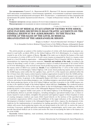 В статье представлен анализ проведения медицинской эвакуации пострадавших с шокогенными травмами, полученными в дорожно-транспортных происшествиях (ДТП), произошедших на федеральной автодороге (ФАД) М‑8 «Холмогоры», в травмоцентр, созданный в одном из арктических регионов России. Целью исследования было выявление особенностей проведения медицинской эвакуации пострадавших в ДТП на ФАД М‑8 с тяжелой травмой, сопровождающейся шоком, в травмоцентр на базе медицинской организации III уровня — Архангельской областной клинической больницы (АОКБ), для разработки рекомендаций по совершенствованию эвакуационных мероприятий. Материалы и методы исследования. По критериям описания серии случаев проведен ретроспективный анализ медицинских документов 49 пострадавших в ДТП на ФАД М‑8 «Холмогоры», получивших тяжелую шокогенную травму, и поступивших на лечение в травмоцентр АОКБ. Результаты. Установлено, что 17 (35%) пострадавших в ДТП на ФАД М‑8 «Холмогоры» с тяжелыми шокогенными травмами были доставлены в травмоцентр АОКБ в течение первого «золотого» часа, а 95,5% травмированных поступили в первые сутки из других травмоцентров на базе медицинских организаций, удаленных от АОКБ и имеющих зоны ответственности на ФАД М‑8. Для эвакуации пострадавших привлекался автомобильный и авиационный медицинский транспорт. В целом, на территории Архангельской области (АО) имеется крайне неравномерное распределение сил и средств для оказания скорой, в том числе скорой специализированной, медицинской помощи, пострадавшим с шокогенными травмами на ФАД М‑8 и их эвакуации в травмоцентр АОКБ из-за значительной протяженности федеральной автодороги (около 600 км). Заключение. Проведенный анализ медицинской эвакуации пострадавших в ДТП на ФАД М‑8 «Холмогоры» с шокогенными травмами в травмоцентр АОКБ показал, что в настоящее время целесообразно: организовать мобильные трассовые пункты на ФАД в Холмогорском, Виноградовском и Шенкурском округах для оказания скорой, в том числе скорой специализированной, медицинской помощи, тяжело травмированным в ДТП; усилить кадровое и материально-техническое обеспечение этих больниц в части создания бригад экстренной медицинской помощи (БЭМП), базирующихся непосредственно на территории указанных лечебных медицинских организаций (ЛМО); обеспечить выполнение целевых показателей «Стратегии развития санитарной авиации в Архангельской области до 2024 года»; совершенствовать развитие телемедицины для осуществления ведущими специалистами АОКБ консультаций пострадавших в ДТП с тяжелыми шокогенными травмами, находящихся на лечении в ЛМО АО, для решения вопроса привлечения, при необходимости, квалифицированных специалистов (анестезиологов, травматологов, а в ряде случаев и других) для оказания специализированной медицинской помощи пострадавшим и решения вопроса об эвакуации последних в травмоцентр АОКБ.