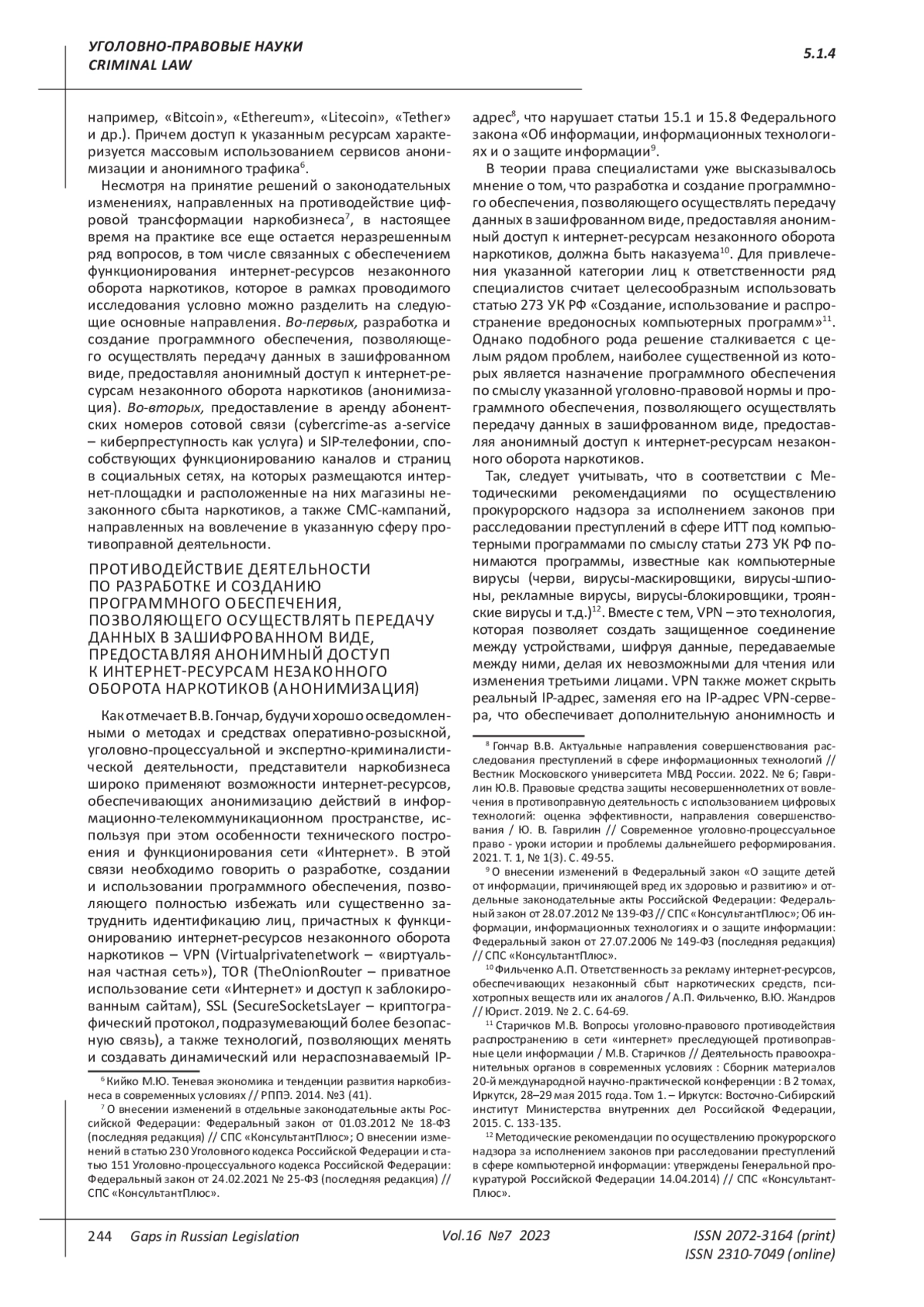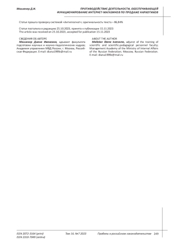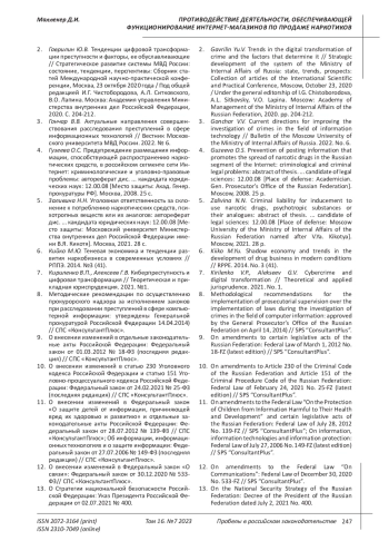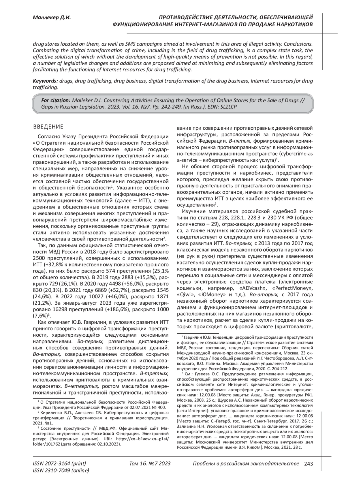 МАЛЛЕКЕР Д. И. ПРОТИВОДЕЙСТВИЕ ДЕЯТЕЛЬНОСТИ, ОБЕСПЕЧИВАЮЩЕЙ ФУНКЦИОНИРОВАНИЕ ИНТЕРНЕТ-МАГАЗИНОВ ПО ПРОДАЖЕ НАРКОТИКОВ // ПРОБЕЛЫ В РОССИЙСКОМ ЗАКОНОДАТЕЛЬСТВЕ. 2023. Т. 16 № 7 (42 СТ.)