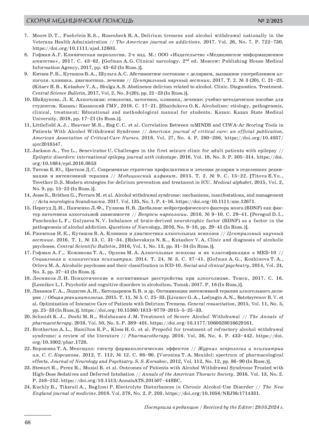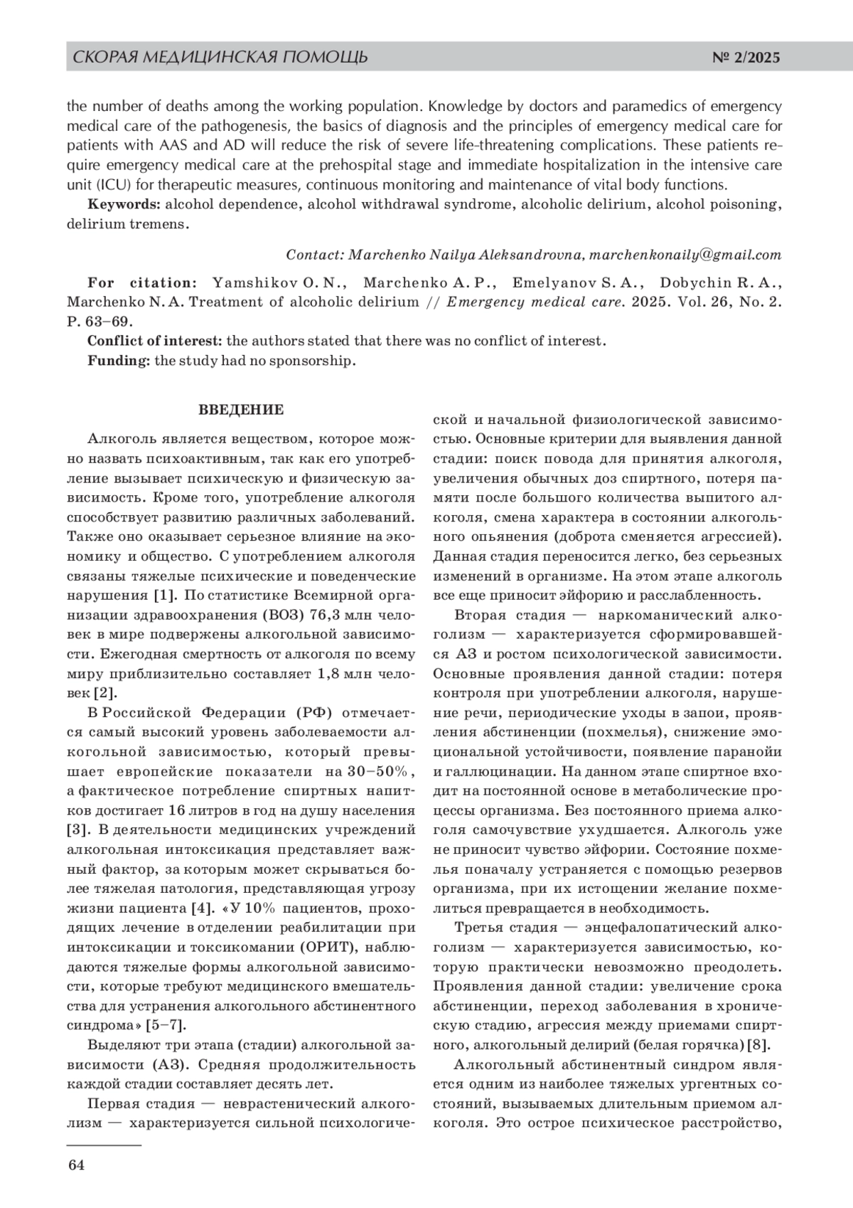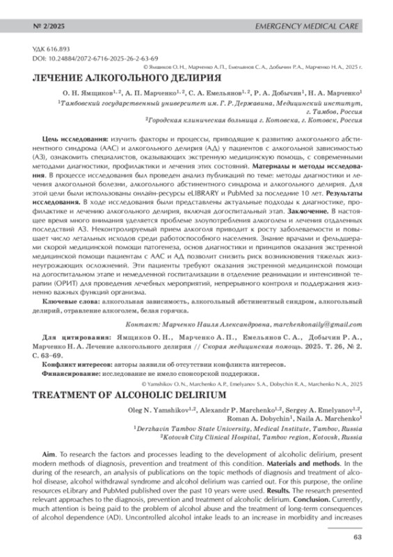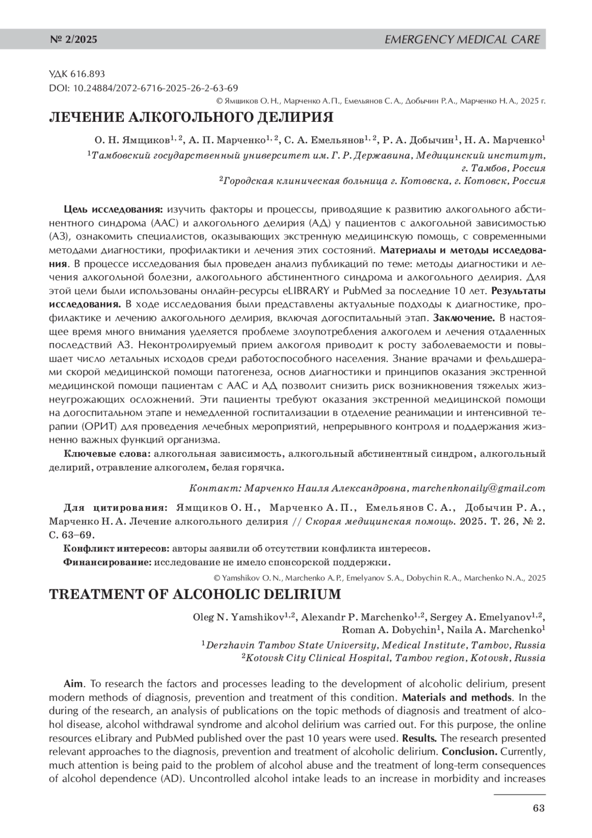 ЯМЩИКОВ О. Н., МАРЧЕНКО А. П., ЕМЕЛЬЯНОВ С. А., ДОБЫЧИН Р. А., МАРЧЕНКО Н. А. ЛЕЧЕНИЕ АЛКОГОЛЬНОГО ДЕЛИРИЯ // СКОРАЯ МЕДИЦИНСКАЯ ПОМОЩЬ. 2025. № 2, ТОМ 26