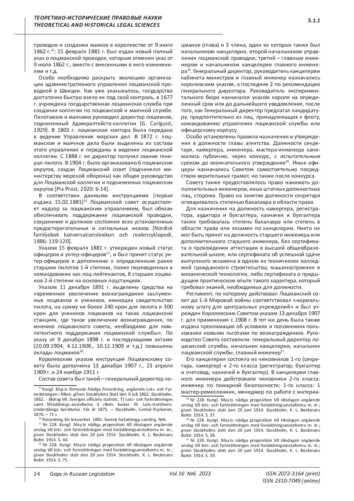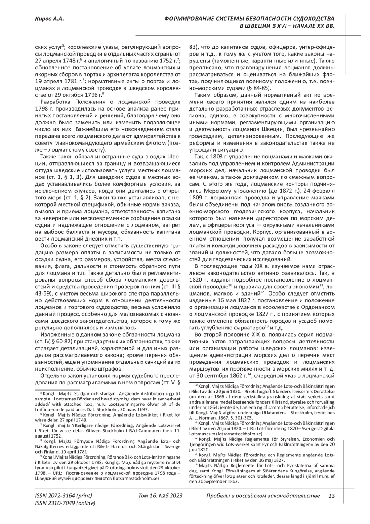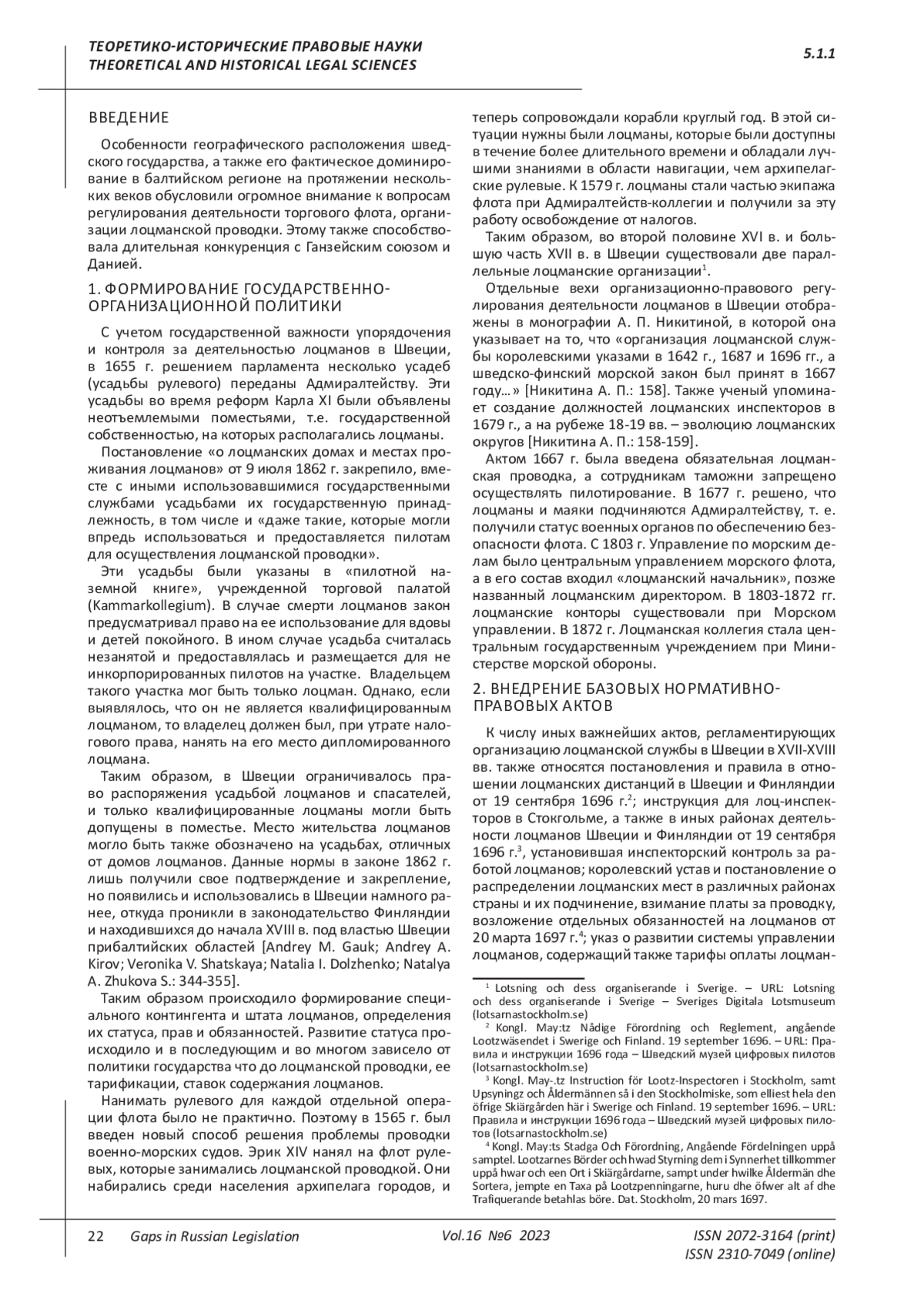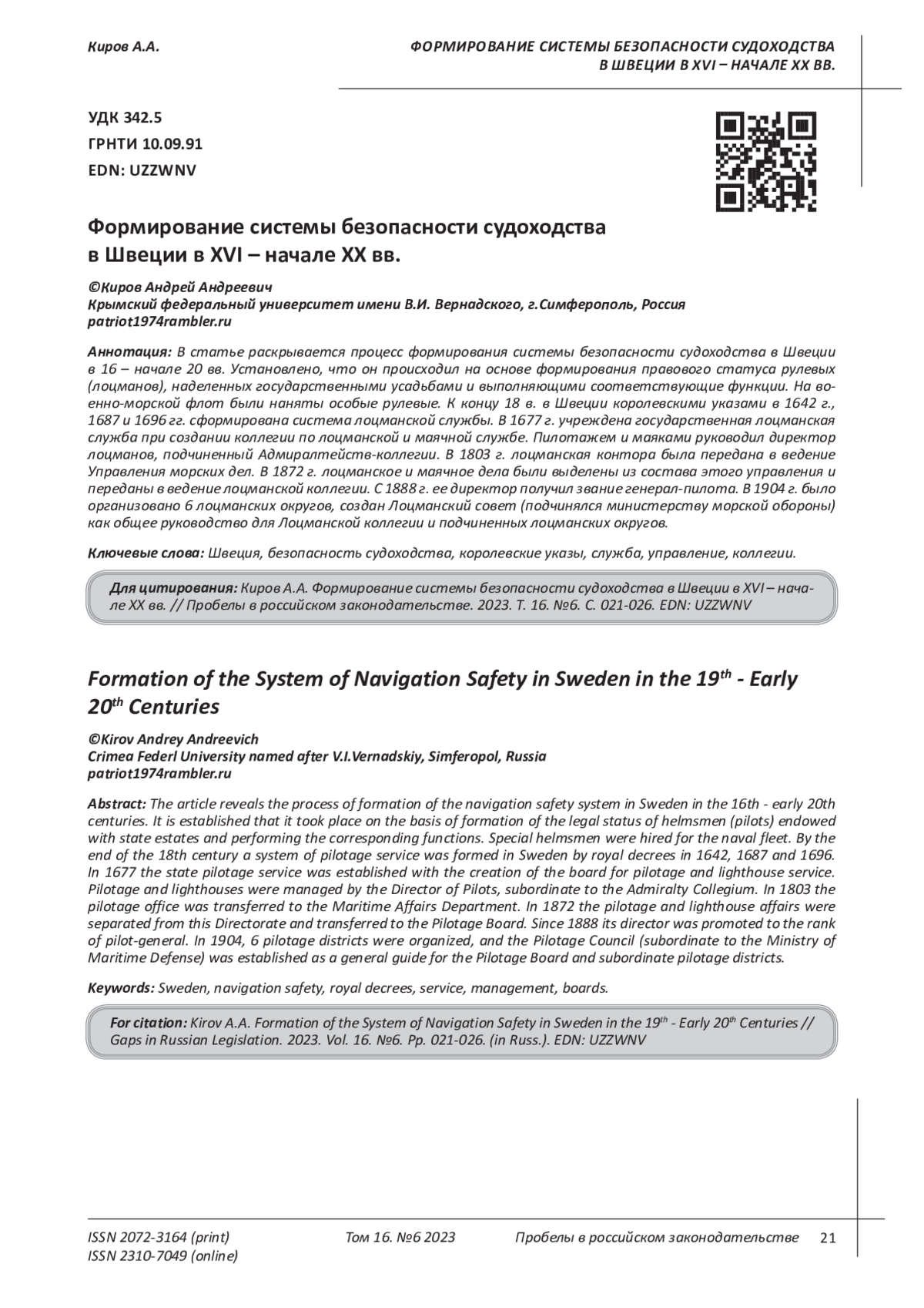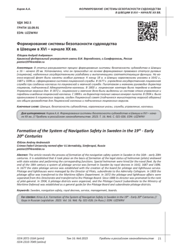 В статье раскрывается процесс формирования системы безопасности судоходства в Швеции в 16 - начале 20 вв. Установлено, что он происходил на основе формирования правового статуса рулевых (лоцманов), наделенных государственными усадьбами и выполняющими соответствующие функции. На военно-морской флот были наняты особые рулевые. К концу 18 в. в Швеции королевскими указами в 1642 г., 1687 и 1696 гг. сформирована система лоцманской службы. В 1677 г. учреждена государственная лоцманская служба при создании коллегии по лоцманской и маячной службе. Пилотажем и маяками руководил директор лоцманов, подчиненный Адмиралтейств-коллегии. В 1803 г. лоцманская контора была передана в ведение Управления морских дел. В 1872 г. лоцманское и маячное дела были выделены из состава этого управления и переданы в ведение лоцманской коллегии. С 1888 г. ее директор получил звание генерал-пилота. В 1904 г. было организовано 6 лоцманских округов, создан Лоцманский совет (подчинялся министерству морской обороны) как общее руководство для Лоцманской коллегии и подчиненных лоцманских округов.