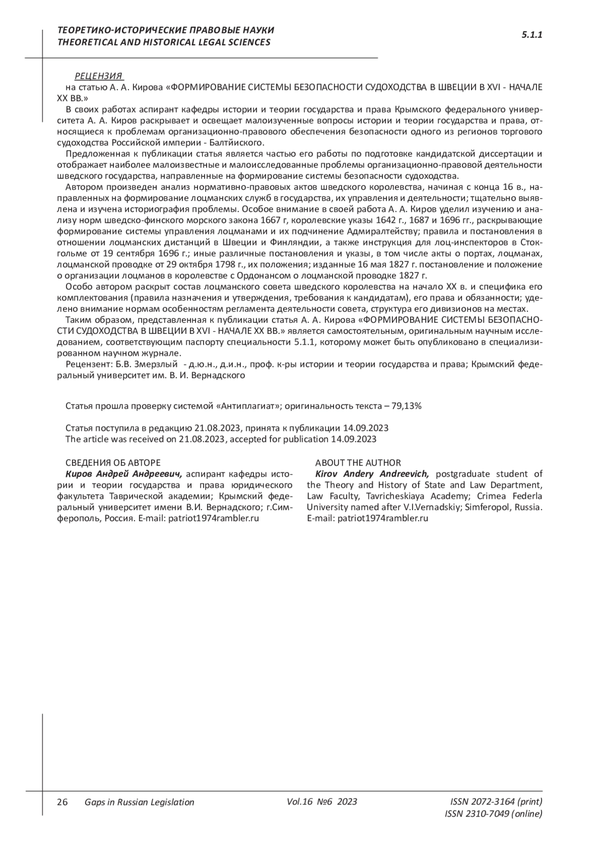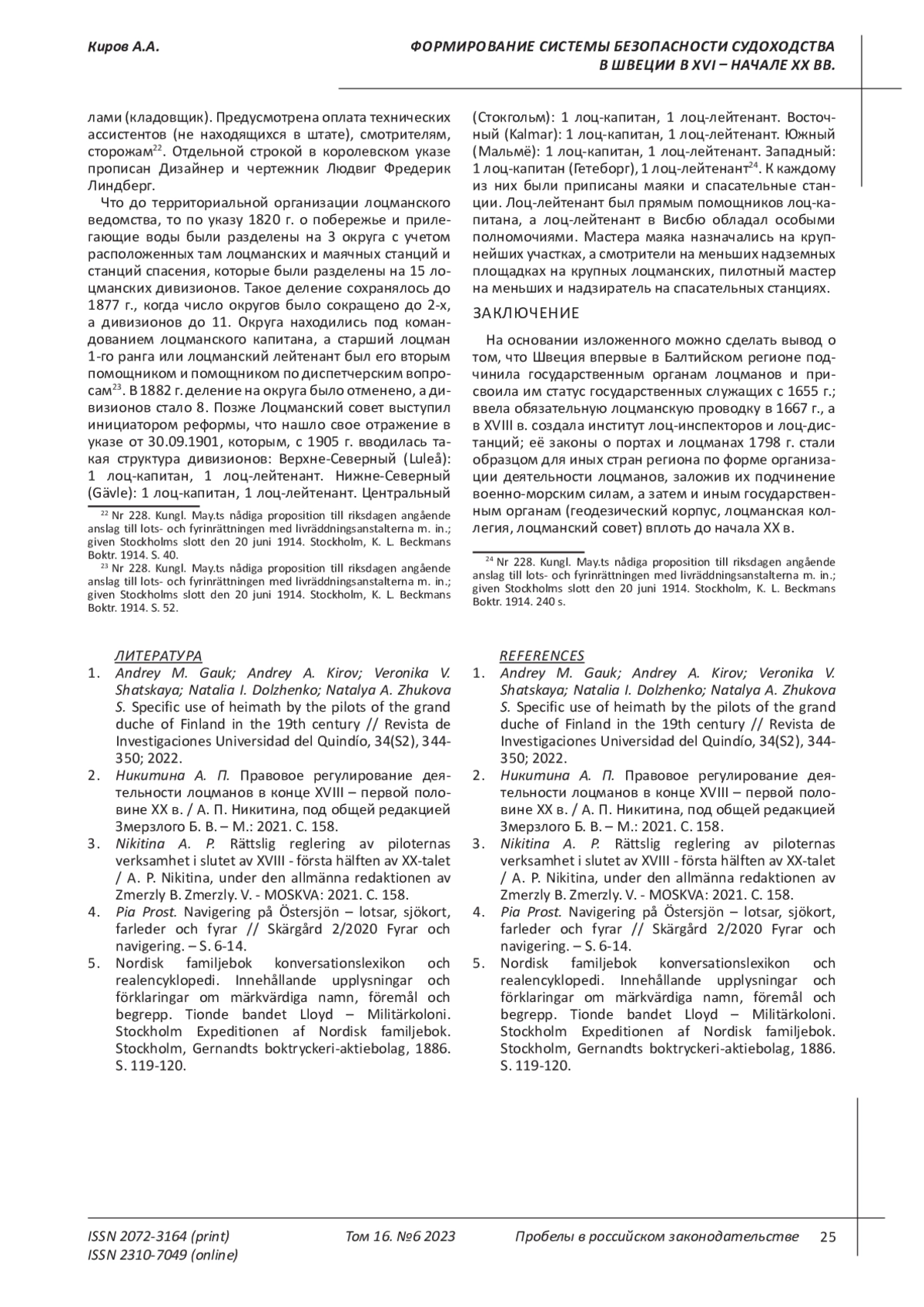 2. 	Никитина А. П. Правовое регулирование деятельности лоцманов в конце XVIII - первой половине ХХ в. / А. П. Никитина, под общей редакцией Змерзлого Б. В. - М.: 2021. С. 158. EDN: FGXAFQ