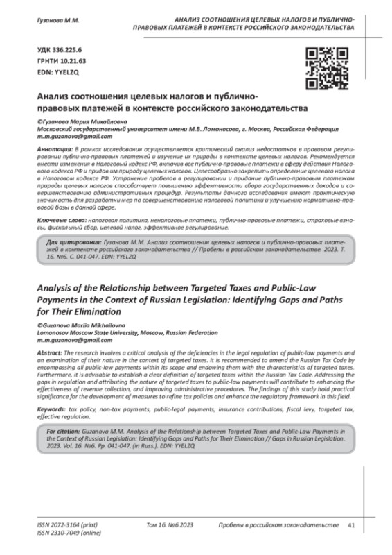 В рамках исследования осуществляется критический анализ недостатков в правовом регулировании публично-правовых платежей и изучение их природы в контексте целевых налогов. Рекомендуется внести изменения в Налоговый кодекс РФ, включив все публично-правовые платежи в сферу действия Налогового кодекса РФ и придав им природу целевых налогов. Целесообразно закрепить определение целевого налога в Налоговом кодексе РФ. Устранение пробелов в регулировании и придание публично-правовым платежам природы целевых налогов способствует повышению эффективности сбора государственных доходов и совершенствованию административных процедур. Результаты данного исследования имеют практическую значимость для разработки мер по совершенствованию налоговой политики и улучшению нормативно-правовой базы в данной сфере.