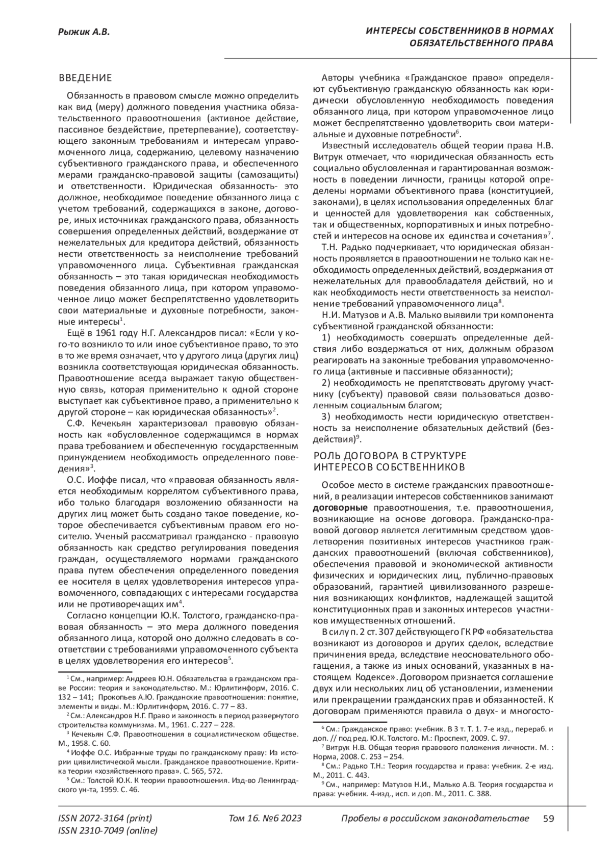 Особое место в системе гражданских правоотношений, в реализации интересов собственников занимают договорные правоотношения, т. е. правоотношения, возникающие на основе договора. Гражданско-правовой договор является легитимным средством удовлетворения позитивных интересов участников гражданских правоотношений (включая собственников), обеспечения правовой и экономической активности физических и юридических лиц, публично-правовых образований, гарантией цивилизованного разрешения возникающих конфликтов, надлежащей защитой конституционных прав и законных интересов участников имущественных отношений.