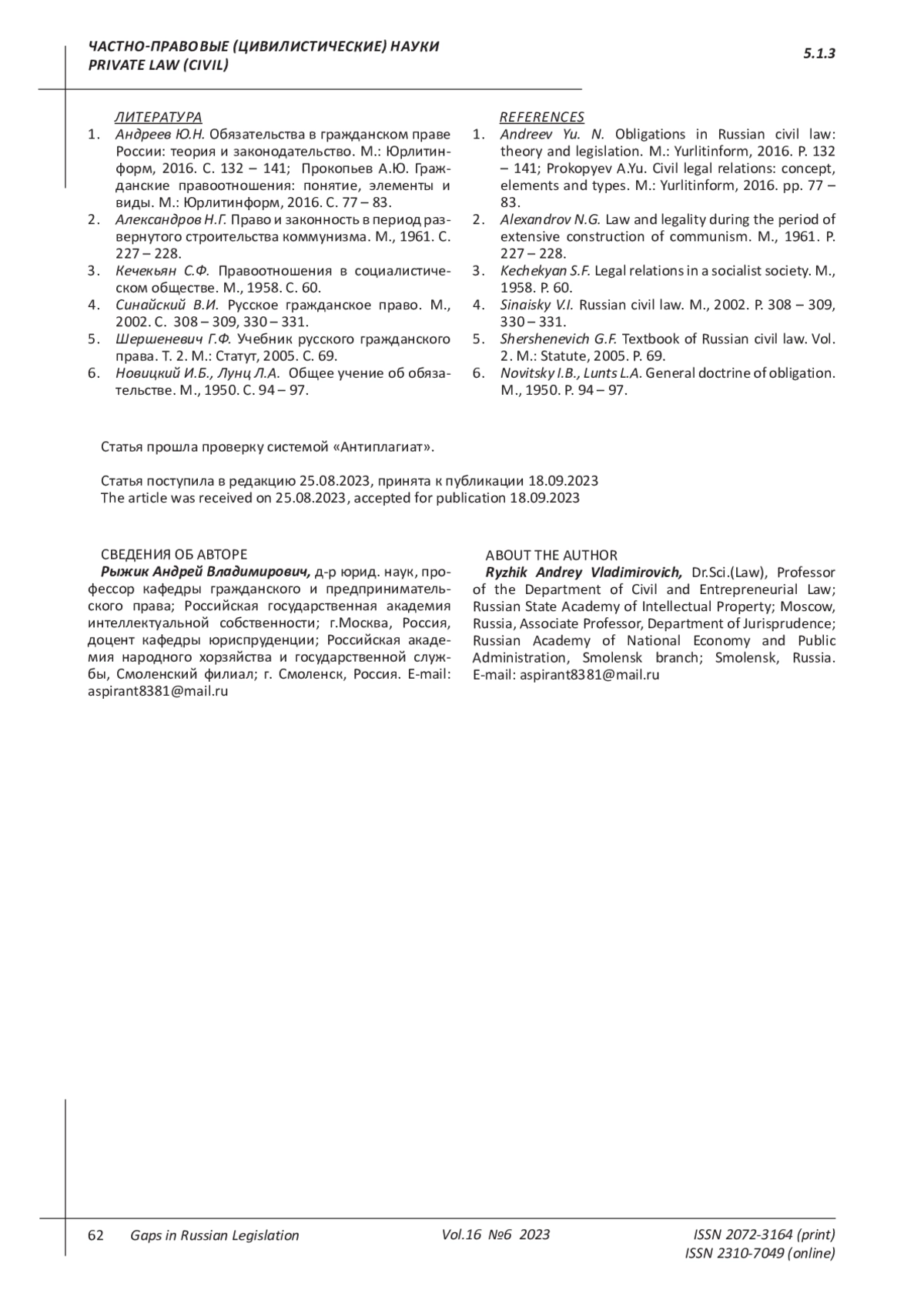 1. 	Андреев Ю.Н. Обязательства в гражданском праве России: теория и законодательство. М.: Юрлитинформ, 2016. С. 132 - 141. EDN: VCRDHT
