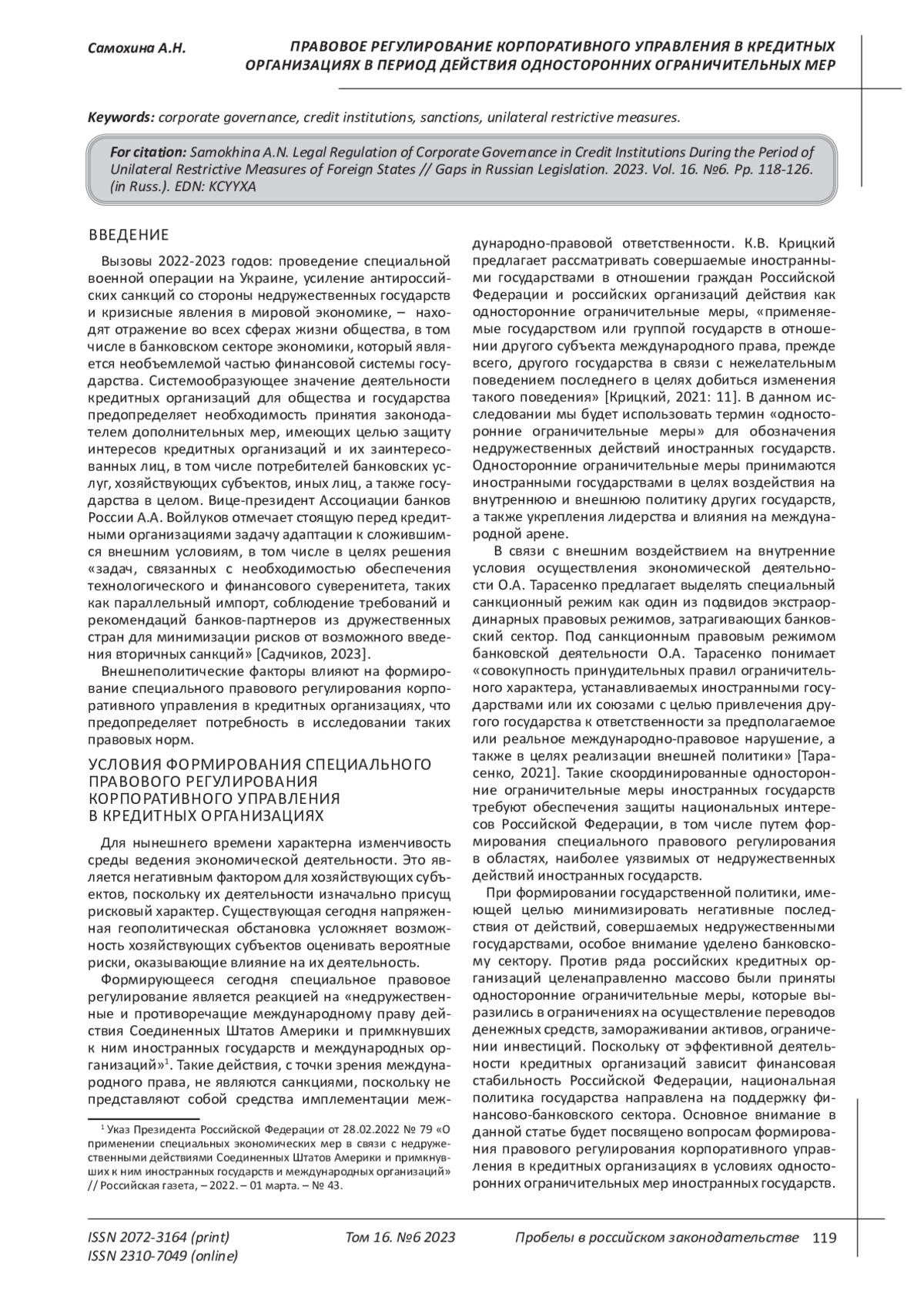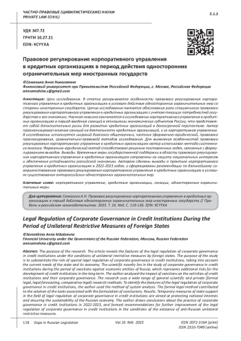 Цель исследования. В статье раскрываются особенности правового регулирования корпоративного управления в кредитных организациях в условиях действия односторонних ограничительных мер со стороны иностранных государств. Целью исследования являются обоснование роли специального правового регулирования корпоративного управления в кредитных организациях с учетом текущих потребностей государства и его экономики. Научная новизна заключается в исследовании корпоративного управления в кредитных организациях в период введения санкций в отношении экономических субъектов России, что представляет собой дополнительные риски для развития кредитных организаций в долгосрочной перспективе. Автор проанализировал влияние санкций на деятельность кредитных организаций, и их корпоративное управление. В исследовании используется широкий диапазон общенаучных, частных (формально-юридический, правового прогнозирования, сравнительно-правовой) методов исследования. Для выявления особенностей правового регулирования корпоративного управления в кредитных организациях автор использовал метода системного анализа. Формально-юридический метод способствовал решению поставленных задач, связанных с формулированием выводов. Выводы. Временные меры государственной поддержки в области правового регулирования корпоративного управления в кредитных организациях направлены на защиту национальных интересов и обеспечение устойчивости российской экономики. Автором сделаны выводы о практике корпоративного управления в кредитных организациях в 2022-2023 годах, и сформированы рекомендации по дальнейшему совершенствованию правового регулирования корпоративного управления в кредитных организациях в условиях существования антироссийских односторонних ограничительных мер.