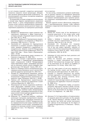 3. 	Гвенетадзе Д.Т., Шумакова А.С. Корпоративное управление в условиях санкций // Юридические науки, правовое государство и современное законодательство: сборник статей XX Международной научно-практической конференции, Пенза, 25 марта 2023 года. - Пенза: Наука и Просвещение. 2023. с. 92-94. EDN: TMFCGM