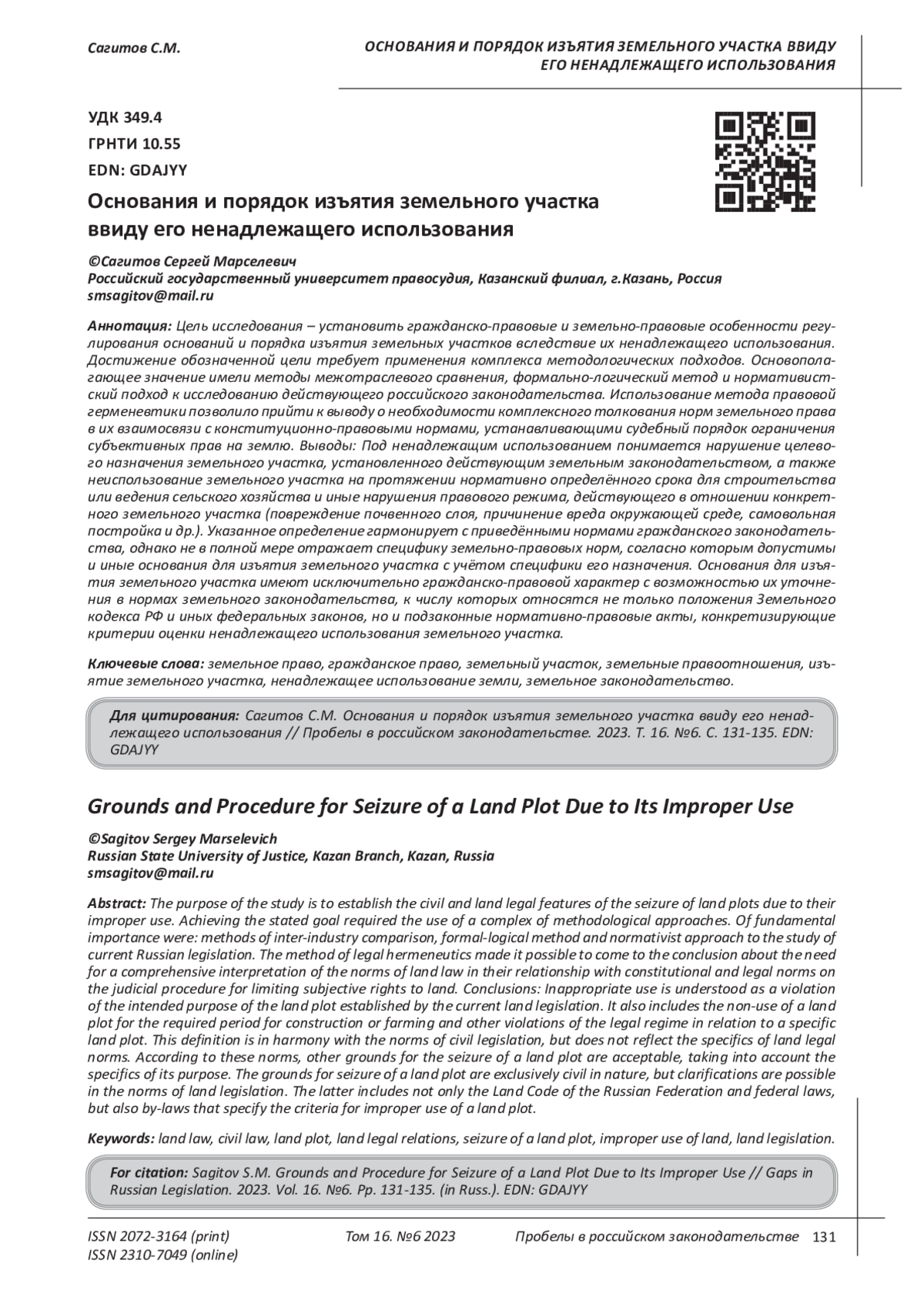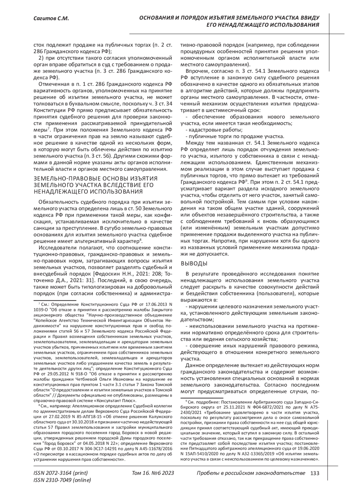 14. 	Федоскин Н.Н. Правовые аспекты изъятия земельных участков за неиспользование по целевому назначению // Modern Science. 2021. № 3-1. С. 207-209. EDN: BDPNTI