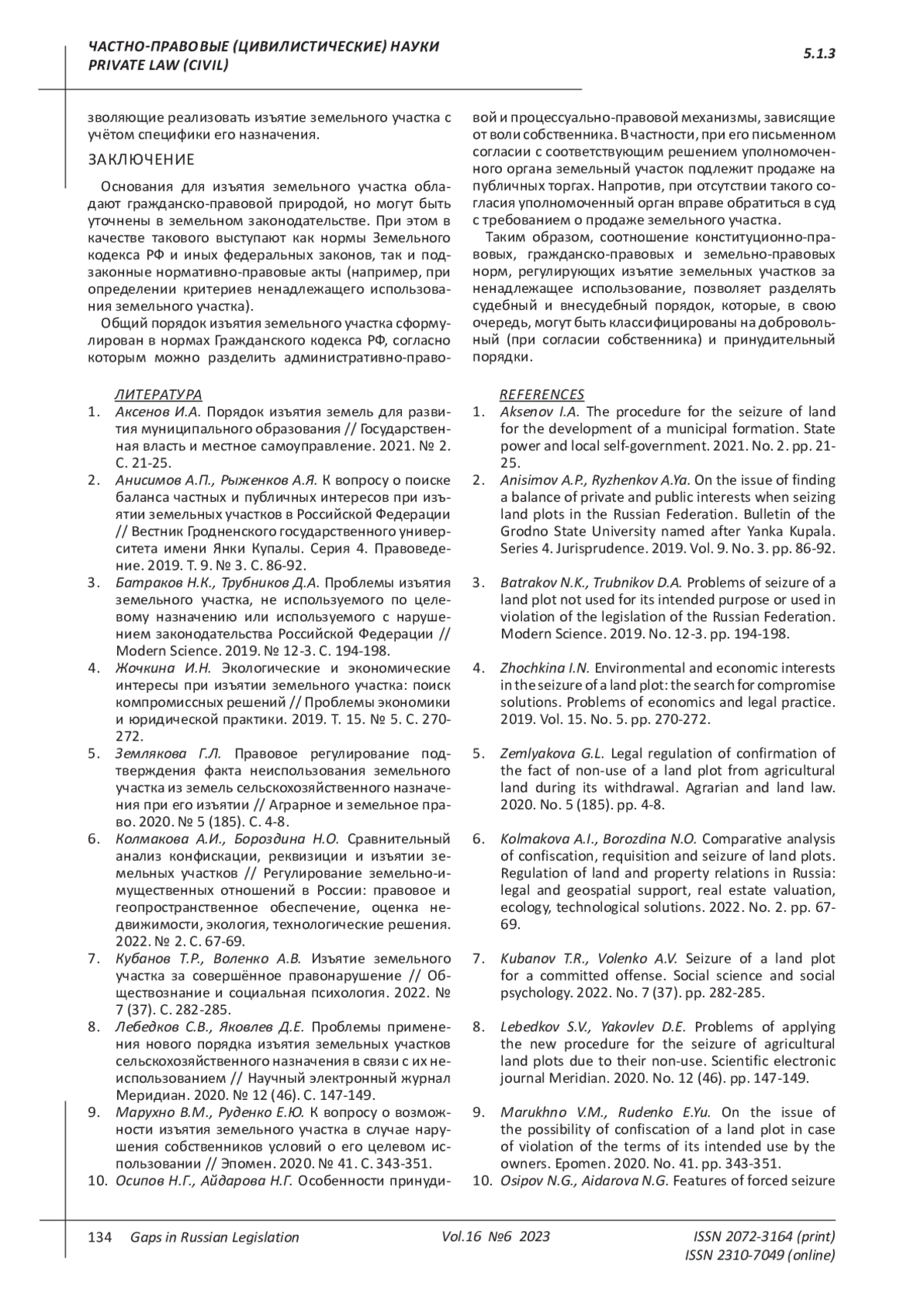 10. 	Осипов Н.Г., Айдарова Н.Г. Особенности принудительного изъятия земельных участков в РФ // Бюллетень Владикавказского института управления. 2022. № 62. С. 53-58. EDN: XFOJZF
