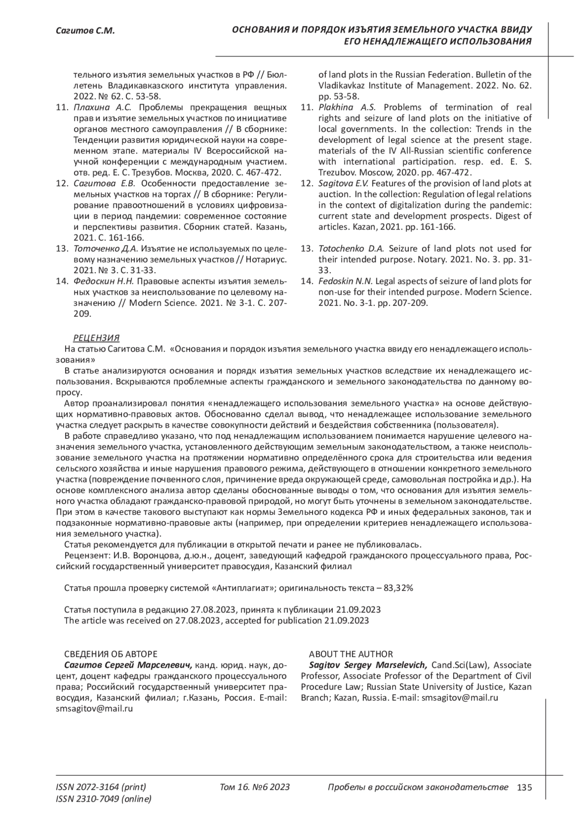 12. 	Сагитова Е.В. Особенности предоставление земельных участков на торгах // В сборнике: Регулирование правоотношений в условиях цифровизации в период пандемии: современное состояние и перспективы развития. Сборник статей. Казань, 2021. С. 161-166. EDN: VTCNFF