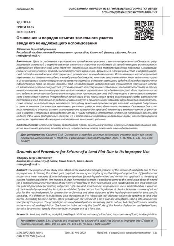 Цель исследования - установить гражданско-правовые и земельно-правовые особенности регулирования оснований и порядка изъятия земельных участков вследствие их ненадлежащего использования. Достижение обозначенной цели требует применения комплекса методологических подходов. Основополагающее значение имели методы межотраслевого сравнения, формально-логический метод и нормативистский подход к исследованию действующего российского законодательства. Использование метода правовой герменевтики позволило прийти к выводу о необходимости комплексного толкования норм земельного права в их взаимосвязи с конституционно-правовыми нормами, устанавливающими судебный порядок ограничения субъективных прав на землю. Выводы: Под ненадлежащим использованием понимается нарушение целевого назначения земельного участка, установленного действующим земельным законодательством, а также неиспользование земельного участка на протяжении нормативно определённого срока для строительства или ведения сельского хозяйства и иные нарушения правового режима, действующего в отношении конкретного земельного участка (повреждение почвенного слоя, причинение вреда окружающей среде, самовольная постройка и др.). Указанное определение гармонирует с приведёнными нормами гражданского законодательства, однако не в полной мере отражает специфику земельно-правовых норм, согласно которым допустимы и иные основания для изъятия земельного участка с учётом специфики его назначения. Основания для изъятия земельного участка имеют исключительно гражданско-правовой характер с возможностью их уточнения в нормах земельного законодательства, к числу которых относятся не только положения Земельного кодекса РФ и иных федеральных законов, но и подзаконные нормативно-правовые акты, конкретизирующие критерии оценки ненадлежащего использования земельного участка.