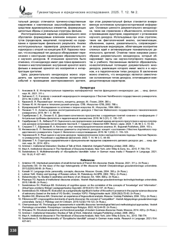11. Чернявская В. Е. Язык оценок в научном дискурсе: терминологическое поле и методологические подходы // Вестник Пермского университета. Российская и зарубежная филология. 2022. Т. 14. № 3. С. 44-55.