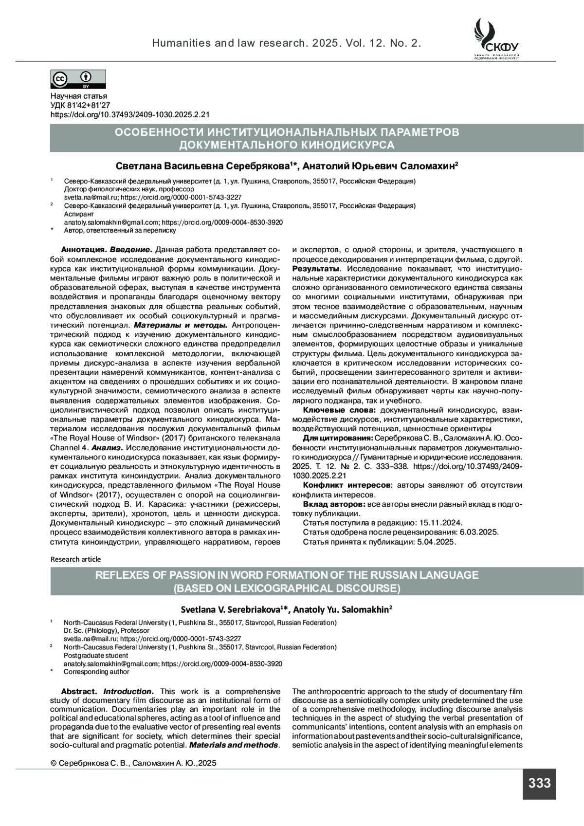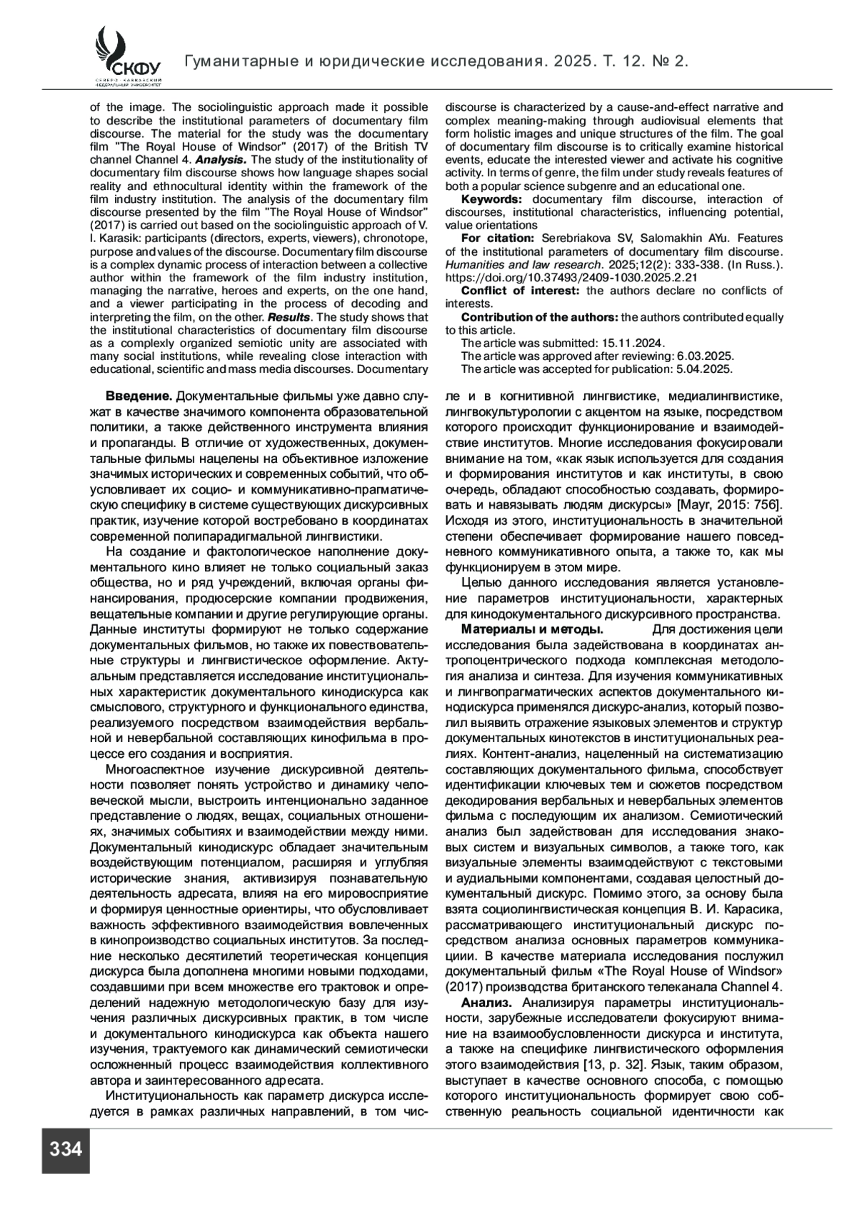 Введение. Данная работа представляет собой комплексное исследование документального кинодискурса как институциональной формы коммуникации. Документальные фильмы играют важную роль в политической и образовательной сферах, выступая в качестве инструмента воздействия и пропаганды благодаря оценочному вектору представления знаковых для общества реальных событий, что обусловливает их особый социокультурный и прагматический потенциал.