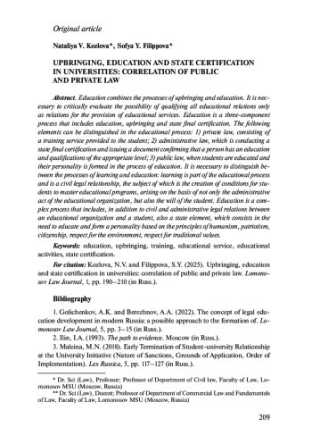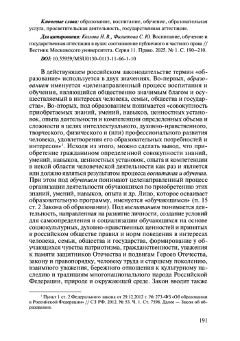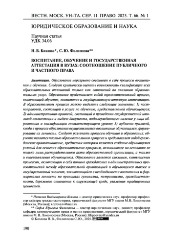 ФИЛИППОВА С. Ю. ВОСПИТАНИЕ, ОБУЧЕНИЕ И ГОСУДАРСТВЕННАЯ АТТЕСТАЦИЯ В ВУЗАХ: СООТНОШЕНИЕ ПУБЛИЧНОГО И ЧАСТНОГО ПРАВА // ВЕСТНИК МОСКОВСКОГО УНИВЕРСИТЕТА. СЕРИЯ 11: ПРАВО. 2025. № 1