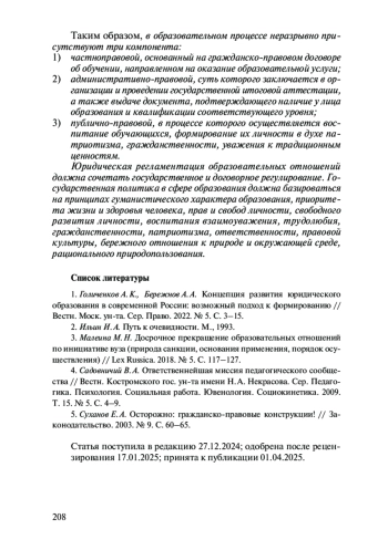 Образование неразрывно соединяет в себе процессы воспитания и обучения. Следует критически оценить возможность квалификации всех образовательных отношений только как отношений по оказанию образовательных услуг. Образование представляет собой трехкомпонентный процесс, включающий обучение, воспитание и государственную итоговую аттестацию. В образовательном процессе можно выделить следующие элементы: 1) частноправовой, состоящий в услуге по обучению, предоставляемой обучающемуся; 2) административно-правовой, состоящий в проведении государственной итоговой аттестации и выдаче документа, подтверждающего наличие у лица образования и квалификации соответствующего уровня; 3) публично-правовой, когда в процессе образования осуществляется воспитание обучающихся, формирование их личности. Следует различать процессы обучения и образования: обучение является частью образовательного процесса и представляет собой гражданское правоотношение, предметом которого является создание обучающимся условий для освоения образовательных программ, возникающее на основании не только лишь распорядительного акта образовательной организации, а также и волеизъявления обучающегося. Образование является сложным, комплексным процессом, включающим в себя помимо гражданских и административных правоотношений между образовательной организацией и обучающимся также и государственный элемент, заключающийся в необходимости воспитания и формирования личности на принципах гуманизма, патриотизма, гражданственности, бережного отношения к окружающей среде, уважения традиционных ценностей.