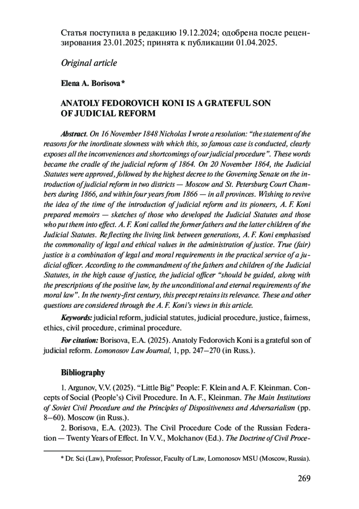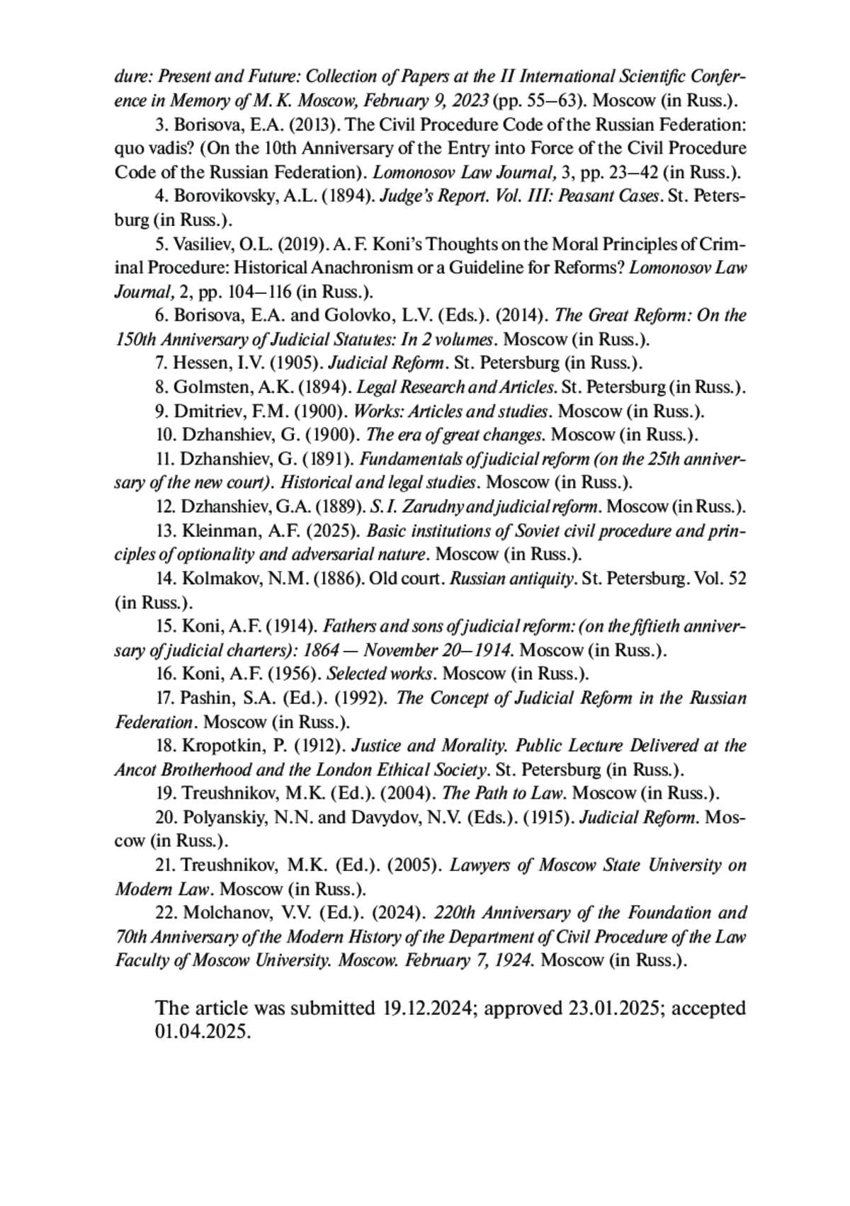 5. 	Васильев О. Л. Мысли А. Ф. Кони о нравственных началах уголовного процесса: исторический анахронизм или ориентир для реформ? // Вестн. Моск. ун-та. Сер. Право. 2019. № 2. С. 104-116.