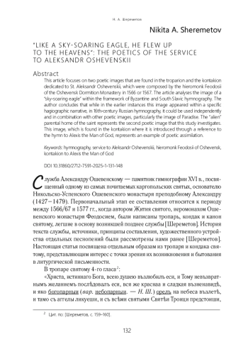 41. 	Шереметов Н. А. Служба преподобному Александру Ошевенскому: к истории текста // Русская агиография: Исследования. Материалы. Публикации. СПб.: Изд-во “Пушкинский Дом”, 2024. Т. 5. С. 119-165. EDN: KIZJLQ