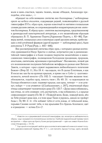 Статья посвящена двум разным образам из песнопений службы преподобному Александру Ошевенскому — тропаря и кондака, написанных иеромонахом НикольскоУспенского Ошевенского монастыря Феодосием в 1566 или 1567 г. Первый — образ «небопарного орла» — рассматривается в контексте византийской и южнославянской гимнографии. Делается вывод, что, в отличие от ранних примеров, в которых появлению образа сопутствовал агиографический сюжет, примеры из русской гимнографии XVI в. демонстрируют его свободное употребление и соединение с другими, в частности образом рая. Второй — образ «чужого» родительского дома из кондака святому, введенный посредством цитаты из песнопения Алексею человеку Божию, демонстрирует один из примеров поэтики уподобления.