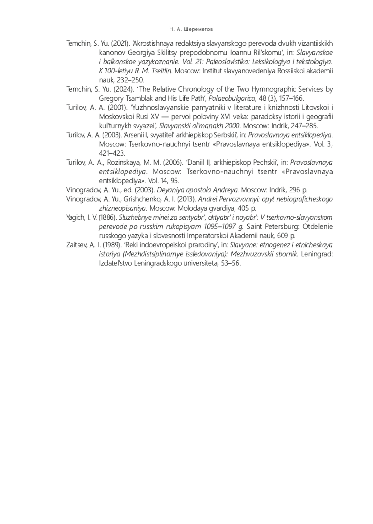 36. 	Темчин С. Ю. Акростишная редакция славянского перевода двух византийских канонов Георгия Скилицы прп. Иоанну Рильскому // Славянское и балканское языкознание. М.: Ин-т славяноведения РАН, 2021. Вып. 21: Палеославистика: Лексикология и текстология: К 100-летию Р. М. Цейтлин. С. 232-250.