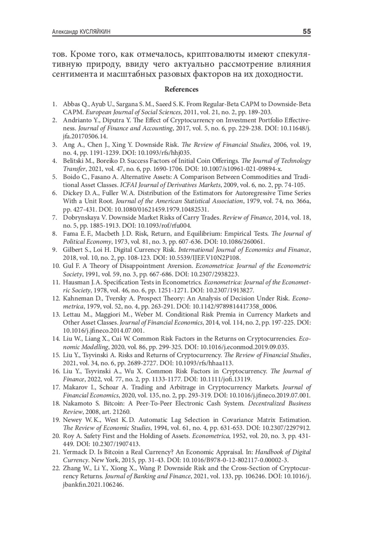 Какую роль в формировании доходности криптовалют играет фактор риска синхронного падения — обесценения отдельных криптовалют и портфелей при падении рынка в целом? Ответу на этот вопрос посвящена настоящая работа. Исследование строится на недельных данных за 2014–2018 годы и охватывает свыше 900 криптовалют. Эмпирическая часть содержит регрессионный анализ, рассматривающий сразу три подхода к измерению систематического риска криптовалют, соответствующих различным положениям криптоактивов в портфелях инвесторов. В рамках этого оцениваются индивидуальные коэффициенты чувствительности криптовалют к рискам, строятся факторные портфели и тестируются портфельные стратегии, проводится кросс-секционный анализ с определением значимых риск-премий — всего более 315 тысяч регрессионных итераций. В результате выявлено, что криптоактивы очень чувствительны к риску обвала на рынке криптовалют, но нечувствительны к происходящему на рынке акций, а также на рынках, относящихся к альтернативным инвестициям, сохраняя свою автономность. Более подверженные риску синхронного падения инструменты в среднем являются более доходными, причем данная закономерность обнаруживается как на уровне отдельных инструментов, так и на уровне крупных портфелей криптовалют и не может быть отнесена к ненаблюдаемым факторам. Усредненная премия за риск синхронного падения составила 1,3% в неделю и оказалась ключевым компонентом доходностей криптовалют. Таким образом, высокие доходности криптоактивов являются лишь компенсацией за соответствующие высокие риски синхронного падения. Одновременно в исследовании подтверждается значимость факторов SMB и WML, отражающих надбавки за риски малой капитализации и высоких прошлых доходностей соответственно, для доходностей криптоактивов и предлагается трехфакторная модель, успешно объясняющая более 50% кросс-секционных доходностей криптовалют, превосходя уже представленные в литературе модели. Полученные результаты могут применяться в рамках дальнейших теоретических исследований, посвященных доходностям криптовалют, и в ходе управления инвестициями в криптовалюты портфельными менеджерами и индивидуальными инвесторами.