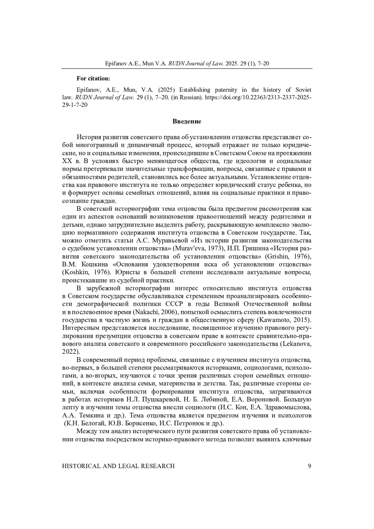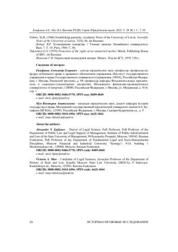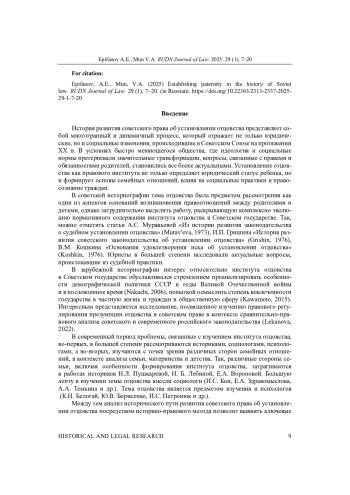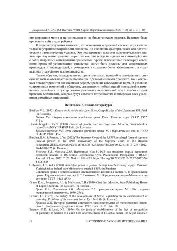 Цель работы - исследование эволюции советского законодательства об установлении отцовства, охватывающее ключевые этапы его формирования и изменения на протяжении XX в., а также особенности правоприменительной деятельности судов. Особое внимание уделяется влиянию социальных и идеологических факторов на правовые нормы, регулирующие этот важный аспект семейных отношений. Анализируется, как законодательные инициативы отражали потребности общества и изменяющиеся представления о семье и родительстве. В заключении подчеркивается значение исторического опыта советского права для современного семейного законодательства, а также необходимость дальнейшего анализа правовых норм в контексте современных вызовов и изменений в обществе. Сформулирован вывод о том, что первые законодательные инициативы Советского государства, касающиеся регулирования института отцовства, подчеркивали принцип равенства между детьми, рожденными в браке, и теми, кто появился на свет вне брака, при этом основным критерием для установления отцовства было кровное родство. В середине 1920-х гг. акцент сместился на фактические отношения с женщиной и совместное ведение хозяйства, что стало основанием для признания отцовства в отношении ребенка. Ужесточение контроля государства над репродуктивной функцией женщин в 1930-1940-е гг. было вызвано стремлением восполнить демографические потери и выражалось в запрете абортов, усилении ответственности за злостный неплатеж алиментов, усложнении процедуры развода, запрете судебного установления отцовства. Начиная со второй половины 1950-х гг. советские законы о браке и семье в вопросах установления отцовства воплощали идею волевого фактора взамен биологического или нормативного.