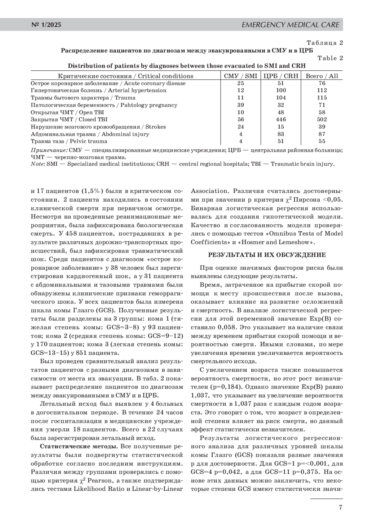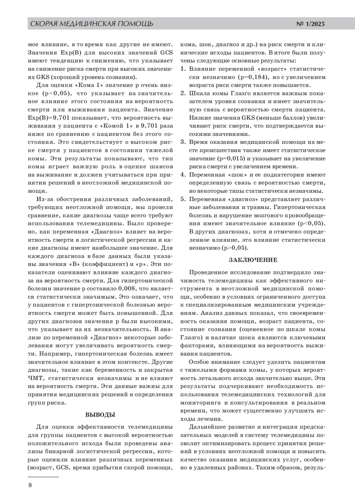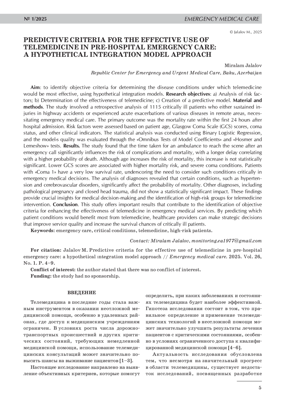 Цель: выявление объективных критериев для определения тех заболеваний, при которых телемедицина будет наиболее эффективна. Задачи исследования: 1) анализ факторов риска; 2) определение эффективности телемедицины; 3) создание предсказательной модели. Материалы и методы. В исследовании проведен ретроспективный анализ 1115 пациентов в критическом состоянии, которые получили травмы в результате аварий на автомагистралях и с обострениями различных заболеваний в удаленных районах, требующие неотложной медицинской помощи. Основным фактором было определение вероятности смертности в первые 24 часа после поступления в стационар. Оценивались такие факторы риска, как возраст пациентов, баллы по шкале комы Глазго (GCS), состояние комы и другие клинические показатели. Статистический анализ был проведен с использованием бинарной логистической регрессии, а качество модели было оценено с помощью тестов «Omnibus Tests of Model Coefficients» и «Hosmer and Lemeshow». Результаты. Исследование показало, что время, затраченное на прибытие скорой помощи на место происшествия после вызова, значительно влияет на риск осложнений и смертности; чем дольше задержка, тем выше вероятность смерти. Хотя возраст увеличивает риск смертности, это увеличение статистически незначительно. Низкие баллы по шкале комы Глазго (GCS) ассоциируются с повышенным риском смертности у пациентов с тяжелой комой. Пациенты с «Комой 1» имеют очень низкие шансы на выживание, что подчеркивает необходимость тщательного учета таких состояний при принятии решений об оказании экстренной медицинской помощи. Анализ диагнозов выявил, что определенные состояния, такие как гипертензия и нарушения мозгового кровообращения, значительно влияют на вероятность смертности. Другие диагнозы, такие как патологическая беременность и закрытая черепно-мозговая травма, не показали статистически значимого влияния. Эти результаты предоставляют важные данные для принятия медицинских решений и выявления групп высокого риска для телемедицинского вмешательства. Заключение. Данное исследование предлагает важные результаты, которые способствуют определению объективных критериев для повышения эффективности телемедицины в экстренной медицинской помощи. Прогнозируя, при каких условиях пациенты получат наибольшую пользу от телемедицины, медицинские учреждения могут принимать стратегические решения, направленные на улучшение качества услуг и повышение шансов на выживание пациентов в критическом состоянии.