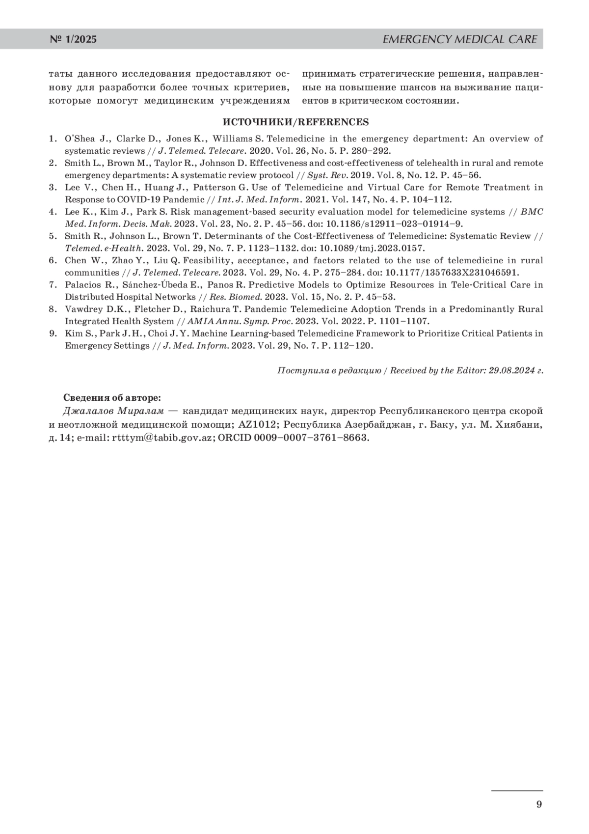 1. O’Shea J., Clarke D., Jones K., Williams S. Telemedicine in the emergency department: An overview of systematic reviews // J. Telemed. Telecare. 2020. Vol. 26, No. 5. P. 280-292.