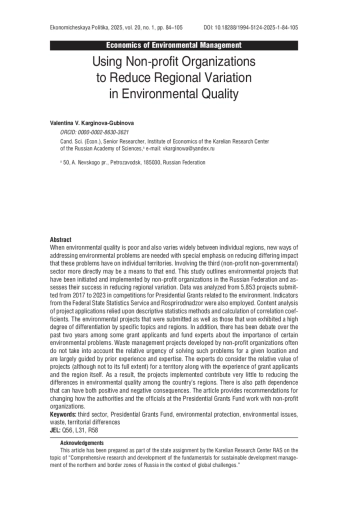 КАРГИНОВА-ГУБИНОВА В. В. РОЛЬ НЕКОММЕРЧЕСКИХ ОРГАНИЗАЦИЙ В СБЛИЖЕНИИ ЭКОЛОГИЧЕСКИХ ХАРАКТЕРИСТИК ТЕРРИТОРИЙ // ЭКОНОМИЧЕСКАЯ ПОЛИТИКА. 2025. ТОМ 20, № 1
