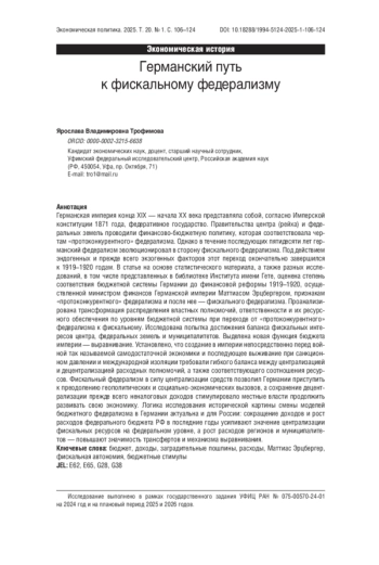 Германская империя конца XIX — начала XX века представляла собой, согласно Имперской конституции 1871 года, федеративное государство. Правительства центра (рейха) и федеральных земель проводили финансово-бюджетную политику, которая соответствовала чертам «протоконкурентного» федерализма. Однако в течение последующих пятидесяти лет германский федерализм эволюционировал в сторону фискального федерализма. Под действием эндогенных и прежде всего экзогенных факторов этот переход окончательно завершился к 1919–1920 годам. В статье на основе статистического материала, а также разных исследований, в том числе представленных в библиотеке Института имени Гете, оценена степень соответствия бюджетной системы Германии до финансовой реформы 1919–1920, осуществленной министром финансов Германской империи Маттиасом Эрцбергером, признакам «протоконкурентного» федерализма и после нее — фискального федерализма. Проанализирована трансформация распределения властных полномочий, ответственности и их ресурсного обеспечения по уровням бюджетной системы при переходе от «протоконкурентного» федерализма к фискальному. Исследована попытка достижения баланса фискальных интересов центра, федеральных земель и муниципалитетов. Выделена новая функция бюджета империи — выравнивание. Установлено, что создание в империи непосредственно перед войной так называемой самодостаточной экономики и последующее выживание при санкционном давлении и международной изоляции требовали гибкого баланса между централизацией и децентрализацией расходных полномочий, а также соответствующего соотношения ресурсов. Фискальный федерализм в силу централизации средств позволил Германии приступить к преодолению геополитических и социально-экономических вызовов, а сохранение децентрализации прежде всего неналоговых доходов стимулировало местные власти продолжить развивать свою экономику. Логика исследования исторической картины смены моделей бюджетного федерализма в Германии актуальна и для России: сокращение доходов и рост расходов федерального бюджета РФ в последние годы усиливают значение централизации фискальных ресурсов на федеральном уровне, а рост расходов регионов и муниципалитетов — повышают значимость трансфертов и механизма выравнивания.