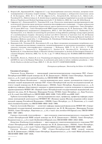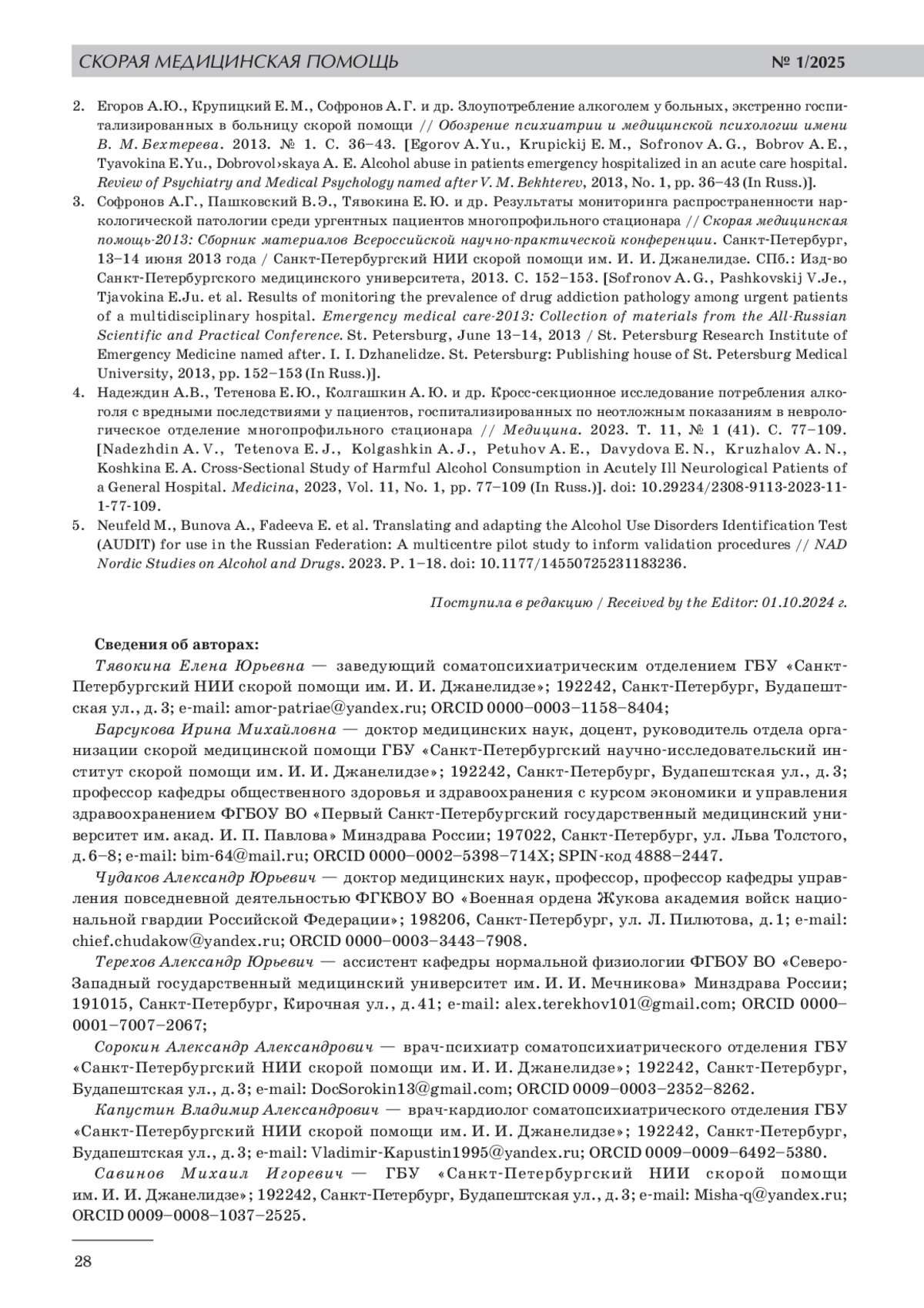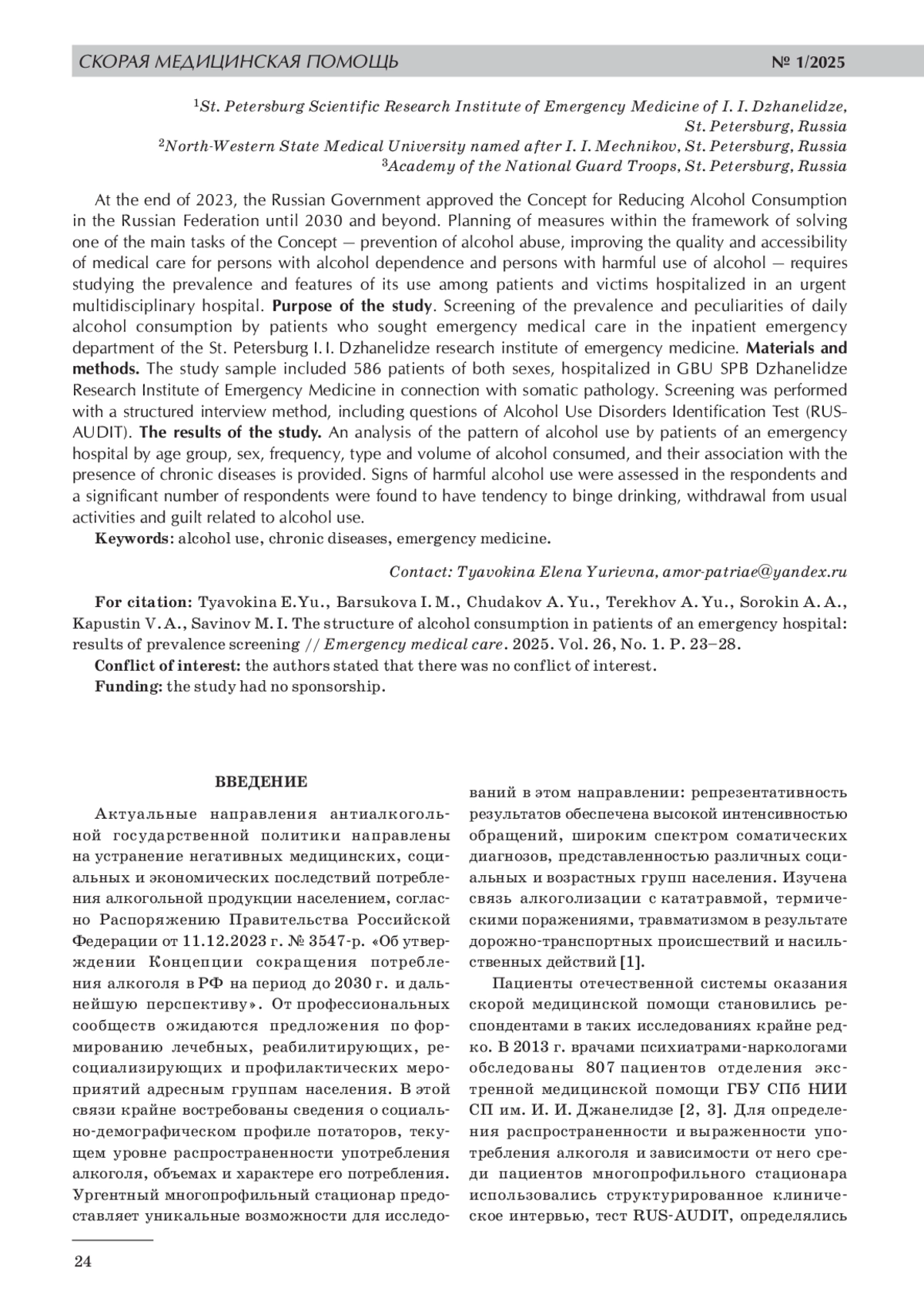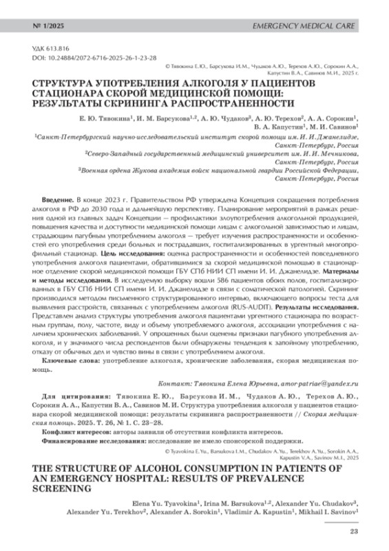 ТЯВОКИНА Е. Ю., БАРСУКОВА И. М., ЧУДАКОВ А. Ю., ТЕРЕХОВ А. Ю., СОРОКИН А. А., КАПУСТИН В. А., САВИНОВ М. И. СТРУКТУРА УПОТРЕБЛЕНИЯ АЛКОГОЛЯ У ПАЦИЕНТОВ СТАЦИОНАРА СКОРОЙ МЕДИЦИНСКОЙ ПОМОЩИ: РЕЗУЛЬТАТЫ СКРИНИНГА РАСПРОСТРАНЕННОСТИ // СКОРАЯ МЕДИЦИНСКАЯ ПОМОЩЬ. 2025. № 1, ТОМ 26