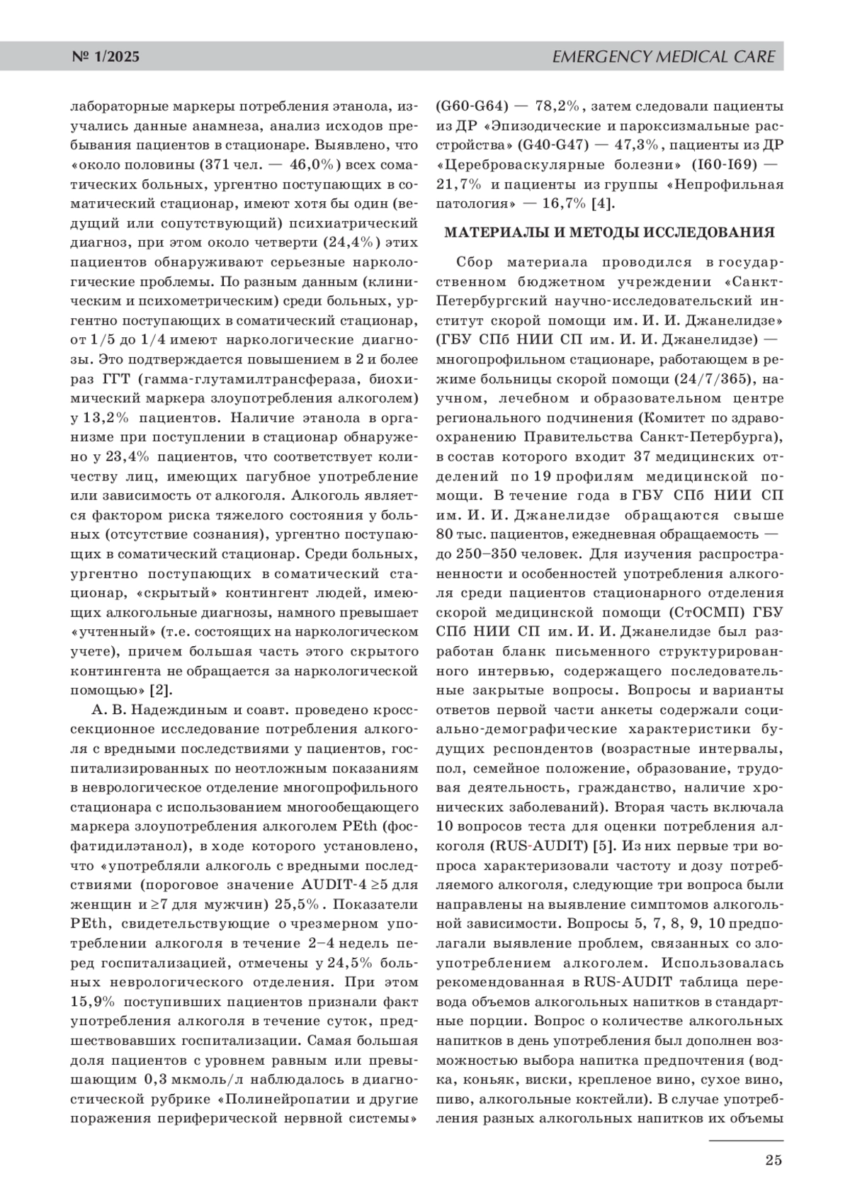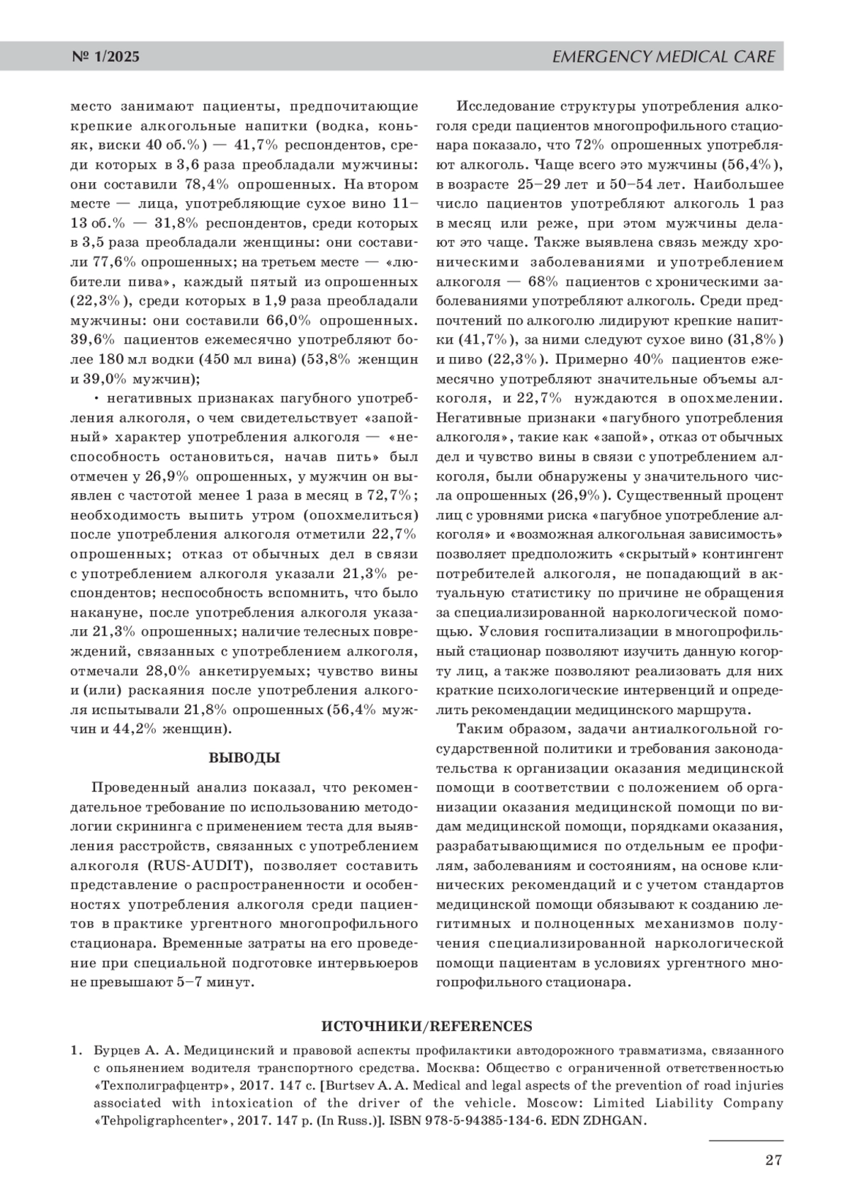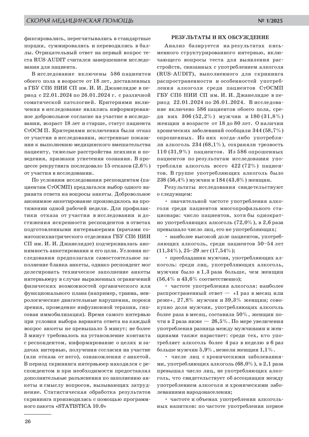 Статья: СТРУКТУРА УПОТРЕБЛЕНИЯ АЛКОГОЛЯ У ПАЦИЕНТОВ СТАЦИОНАРА СКОРОЙ МЕДИЦИНСКОЙ ПОМОЩИ: РЕЗУЛЬТАТЫ СКРИНИНГА РАСПРОСТРАНЕННОСТИ (2025)