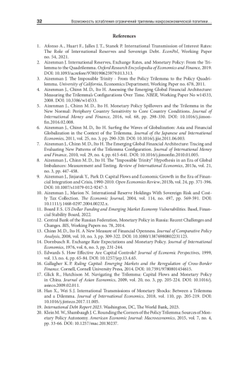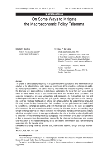 ГОЛОТВИН Н. Д., СЕРЕГИНА С. Ф. ВОЗМОЖНОСТЬ ОСЛАБЛЕНИЯ ОГРАНИЧЕНИЙ ТРИЛЕММЫ МАКРОЭКОНОМИЧЕСКОЙ ПОЛИТИКИ В СОВРЕМЕННЫХ УСЛОВИЯХ // ЭКОНОМИЧЕСКАЯ ПОЛИТИКА. 2025. ТОМ 20, № 2