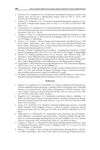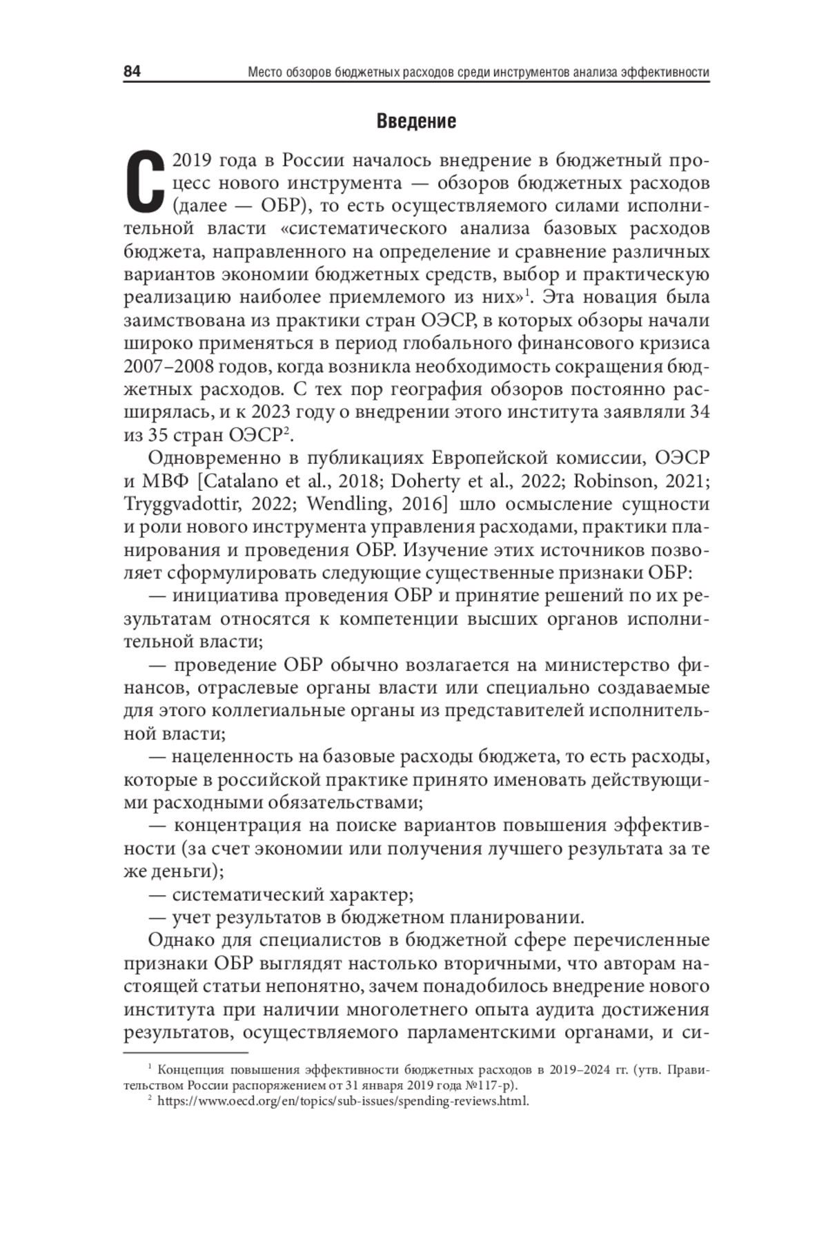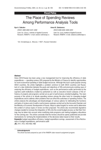 В России с 2019 года появился новый инструмент управления бюджетной эффективностью — обзоры бюджетных расходов (ОБР), подготовка которых осуществляется силами Минфина и преследует цель выявить возможности для более экономного расходования бюджетных ресурсов. Несмотря на популярность данного инструмента среди стран ОЭСР (по итогам 2023 года его применяли 34 из 35 членов этой организации), общей для зарубежных государств и России проблемой, по мнению авторов, является отсутствие четкого разграничения целей и задач ОБР и ранее возникших инструментов анализа эффективности бюджетных расходов, включая аудит эффективности, возложенный на высшие органы аудита, создаваемые парламентом, и анализ эффективности проектов и программ, осуществляемый силами исполнительной власти в рамках бюджетирования, ориентированного на результат. Основной целью статьи является поиск места ОБР среди других инструментов управления бюджетными расходами, а также подходов к решению других проблем, от которых зависит качество функционирования этого института. Авторы анализируют преимущества и недостатки различных вариантов разграничения функций и задач обзоров и аудита/анализа эффективности, осуществляемого Счетной палатой и Минэкономразвития России, предлагают подходы к выбору объектов обзоров и определению содержания различных их видов. В статье сформулированы предложения относительно изменений законодательства, необходимых для повышения степени интеграции ОБР в бюджетный процесс, чтобы обеспечить возможность учета их результатов при внесении изменений в профильные госпрограммы и уточнении распределения бюджетных ассигнований на предстоящий год. Необходимым, по мнению авторов, является также открытая публикация обзоров и внедрение механизмов контроля за реализацией решений, принятых по их итогам.