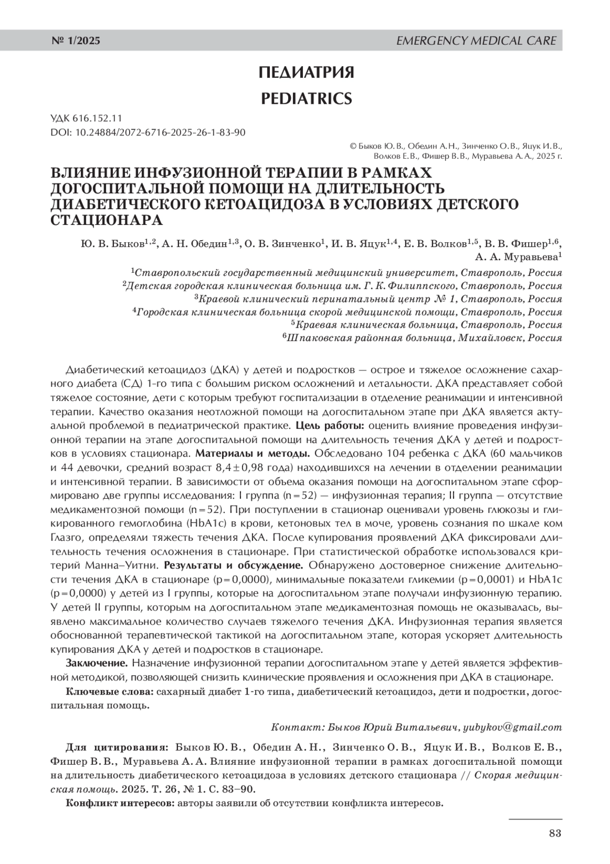 БЫКОВ Ю. В., ОБЕДИН А. Н., ЗИНЧЕНКО О. В., ЯЦУК И. В., ВОЛКОВ Е. В., ФИШЕР В. В., МУРАВЬЁВА А. А. ВЛИЯНИЕ ИНФУЗИОННОЙ ТЕРАПИИ В РАМКАХ ДОГОСПИТАЛЬНОЙ ПОМОЩИ НА ДЛИТЕЛЬНОСТЬ ДИАБЕТИЧЕСКОГО КЕТОАЦИДОЗА В УСЛОВИЯХ ДЕТСКОГО СТАЦИОНАРА // СКОРАЯ МЕДИЦИНСКАЯ ПОМОЩЬ. 2025. № 1, ТОМ 26