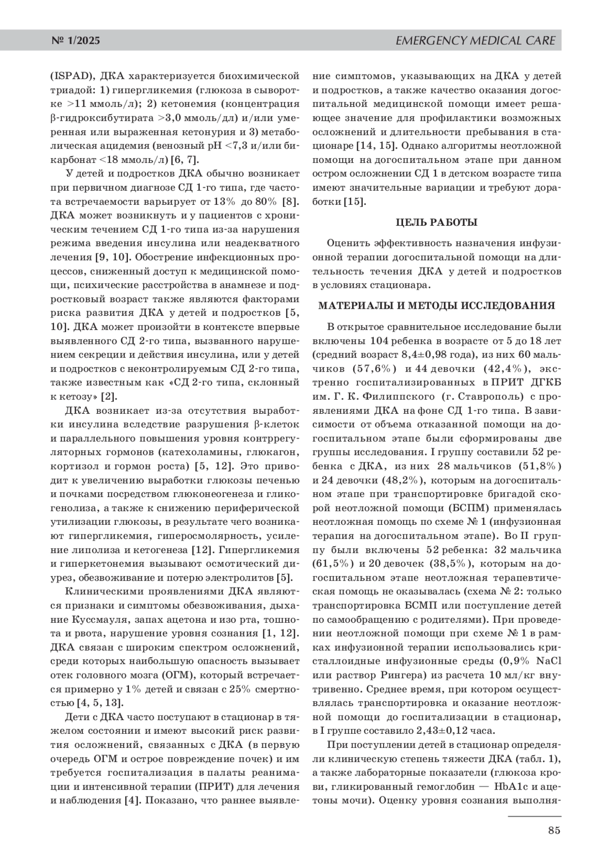 Статья: ВЛИЯНИЕ ИНФУЗИОННОЙ ТЕРАПИИ В РАМКАХ ДОГОСПИТАЛЬНОЙ ПОМОЩИ НА ДЛИТЕЛЬНОСТЬ ДИАБЕТИЧЕСКОГО КЕТОАЦИДОЗА В УСЛОВИЯХ ДЕТСКОГО СТАЦИОНАРА (2025)