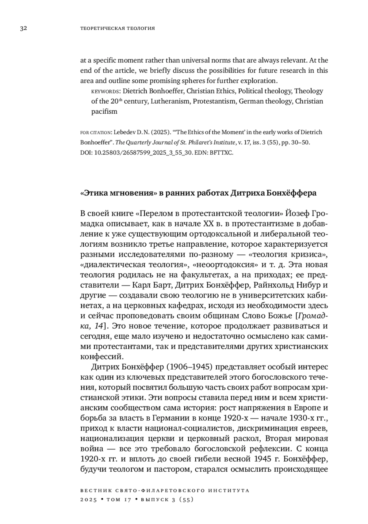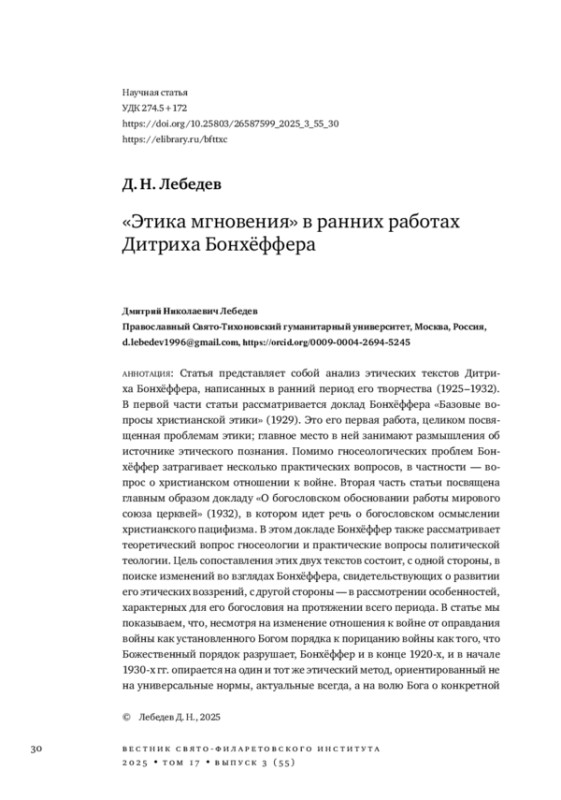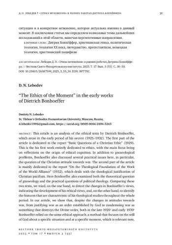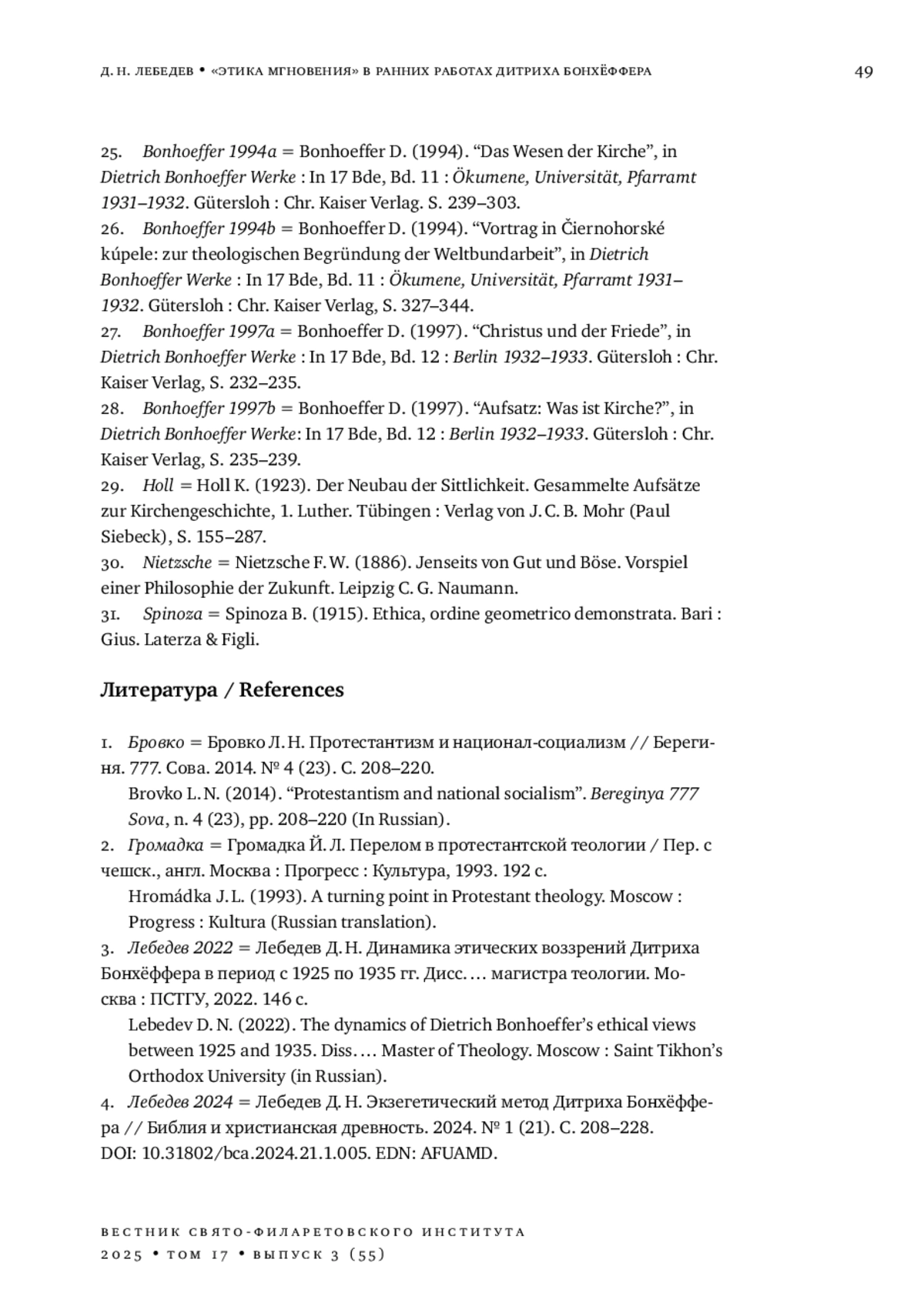 34. 	Лебедев Д. Н. Динамика этических воззрений Дитриха Бонхёффера в период с 1925 по 1935 гг. Дисс. … магистра теологии. Москва: ПСТГУ, 2022. 146 с.