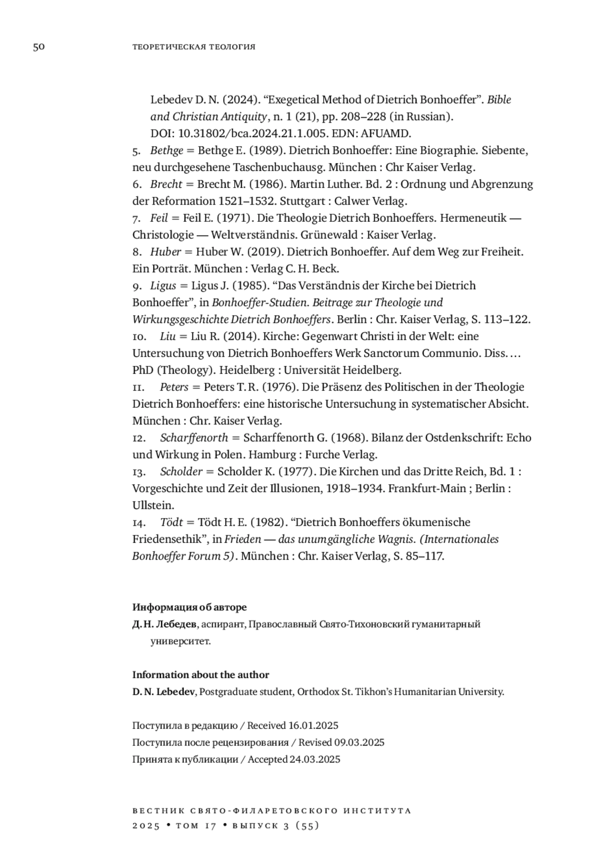 35. 	Лебедев Д. Н. Экзегетический метод Дитриха Бонхёффера // Библия и христианская древность. 2024. № 1 (21). С. 208-228. DOI: 10.31802/bca.2024.21.1.005