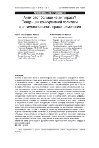 21. Шаститко А. Е., Павлова Н. С. Антиконкурентные последствия антимонопольной политики: кейс мобильных операторов // Вопросы государственного и муниципального управления. 2021. № 2. С. 7-33.