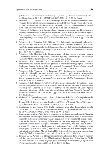 25. Avdasheva S., Golovanova S., Katsoulacos Y. The Impact of Performance Measurement on the Selection of Enforcement Targets by Competition Authorities: The Russian Experience in an International Context // Public Performance & Management Review. 2019. Vol. 42. No 2. P. 329-356. https://doi.org/10.1080/15309576.2018.1441036.
