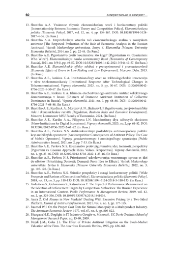 14. Шаститко А. А. Эмпирическая оценка роли экономического анализа в российском антитрасте // Вестник Московского университета. Серия 6. Экономика. 2014. № 2. С. 22-44.