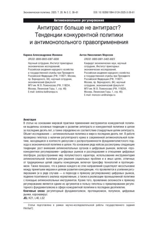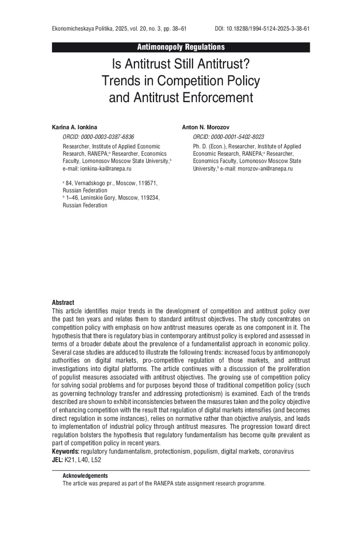 В статье на основании мировой практики применения инструментов конкурентной политики выделены основные тенденции в развитии антитраста и конкурентной политики в целом за последние десять лет, а также определено их соответствие стандартным целям антитраста. Объект исследования — антимонопольная политика в мире в последние десять лет. В работе проверена гипотеза о наличии регуляторного крена в современной антимонопольной политике, находящаяся в контексте дискуссии о распространенности фундаменталистского подхода в экономической политике в целом. На основании ряда кейсов рассмотрены следующие тенденции: рост внимания антимонопольных органов к цифровым рынкам, включая «проконкурентное регулирование» цифровых рынков и расследования в отношении цифровых платформ, распространение мер популистского характера, использование инструментария антимонопольной политики для решения социальных проблем и в иных целях, отличных от традиционных целей защиты конкуренции, включая трансфер технологий и протекционизм. Также показано, что в рамках каждого из этих направлений существуют несостыковки между принятыми мерами и целями развития конкуренции, что проявляется в усилении регулирования (и в ряде случаев — в переходе к прямому регулированию) цифровых рынков, подмене позитивного анализа нормативным, а также в реализации промышленной политики с помощью антимонопольных инструментов. Кроме того, проявление склонности к прямому регулированию является одним из аргументов в пользу гипотезы о превалировании регуляторного фундаментализма в сфере конкурентной политики в последнее десятилетие.