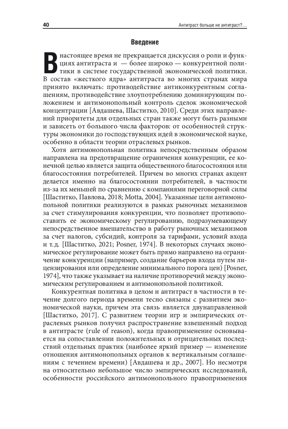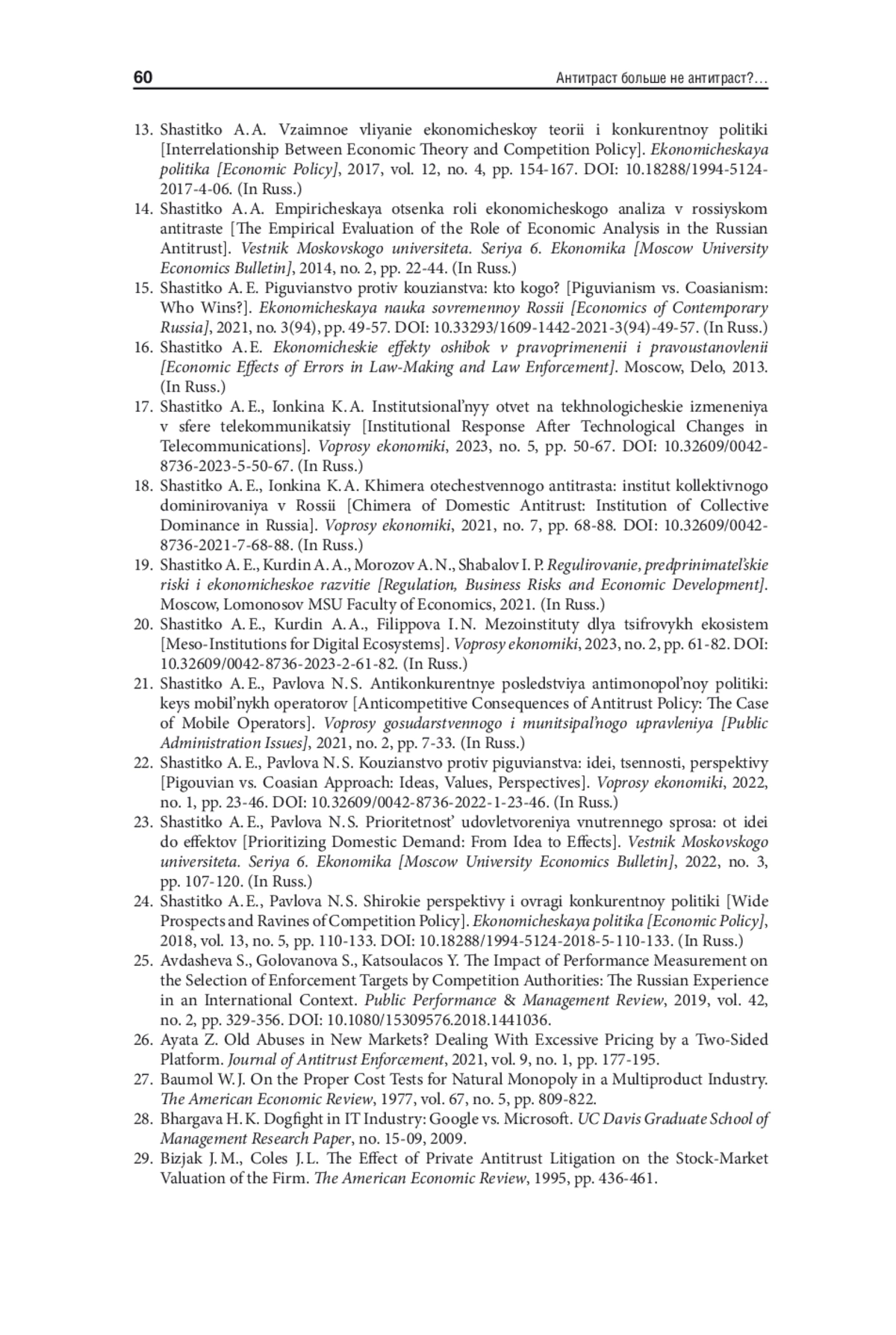 6. Авдашева С. Б., Шаститко A. E., Калмычкова Е. Н. Экономические основы антимонопольной политики: российская практика в контексте мирового опыта // Экономический журнал ВШЭ. 2007. Т. 11. № 1. С. 89-123.