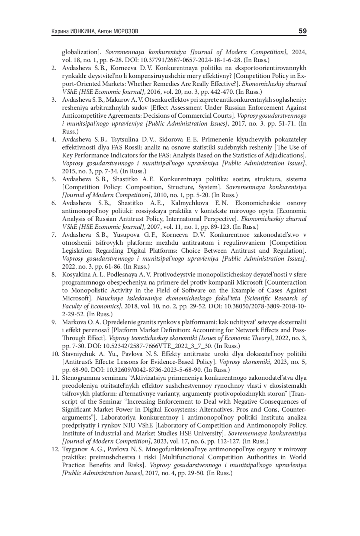 1. Авдашева С. Б. Задачи и возможности конкурентной политики в России в условиях деглобализации // Современная конкуренция. 2024. Т. 18. № 1. С. 6-28. https://doi.org/10.37791/2687-0657-2024-18-1-6-28.