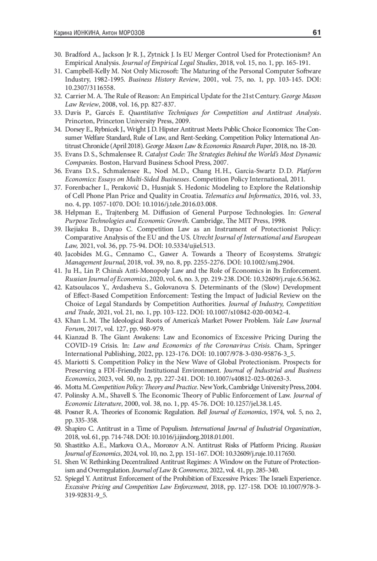 45. Mariotti S. Competition Policy in the New Wave of Global Protectionism. Prospects for Preserving a FDI-Friendly Institutional Environment // Journal of Industrial and Business Economics. 2023. Vol. 50(2). P. 227-241. https://doi.org/10.1007/s40812-023-00263-3.