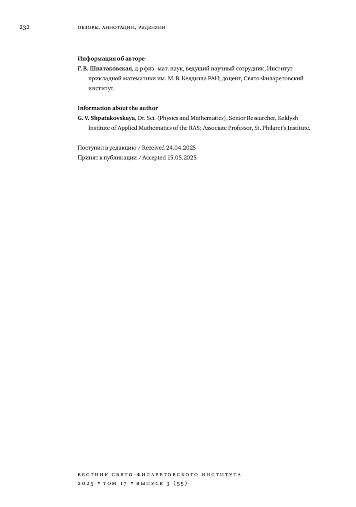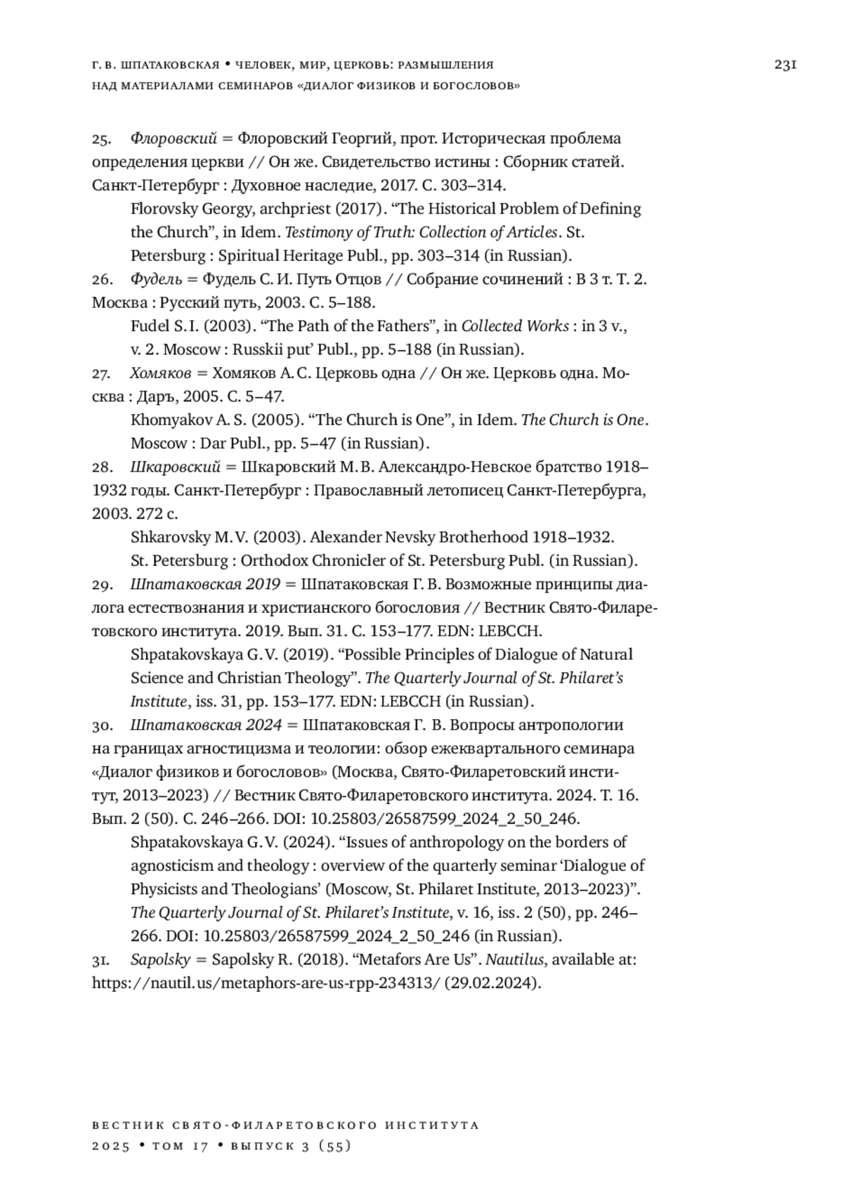 29. Шпатаковская Г. В. Возможные принципы диалога естествознания и христианского богословия // Вестник Свято-Филаретовского института. 2019. Вып. 31. С. 153-177.