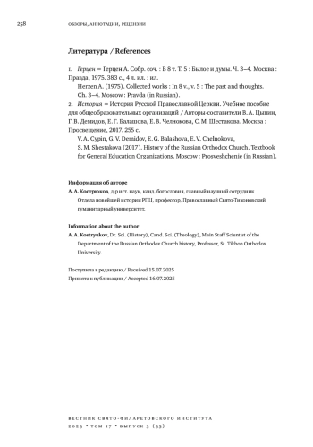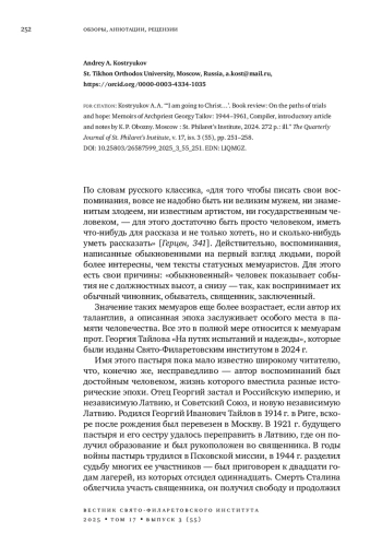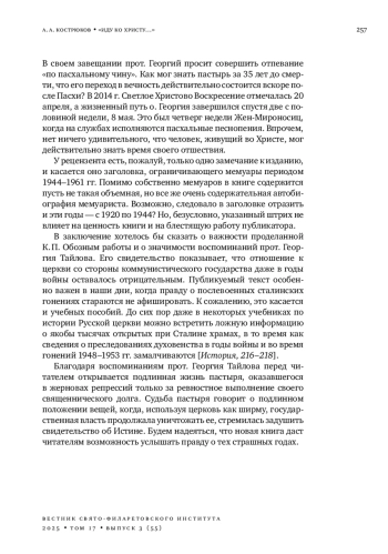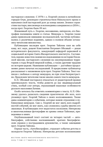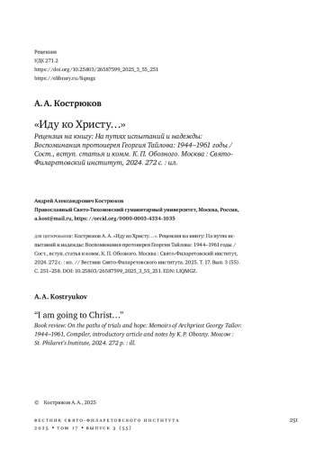 КОСТРЮКОВ А. А. «ИДУ КО ХРИСТУ…» РЕЦЕНЗИЯ НА КНИГУ: НА ПУТЯХ ИСПЫТАНИЙ И НАДЕЖДЫ: ВОСПОМИНАНИЯ ПРОТОИЕРЕЯ ГЕОРГИЯ ТАЙЛОВА: 1944-1961 ГОДЫ / СОСТ., ВСТУП. СТАТЬЯ И КОММ. К. П. ОБОЗНОГО. МОСКВА: СВЯТО- ФИЛАРЕТОВСКИЙ ИНСТИТУТ, 2024. 272 С.: ИЛ. // ВЕСТНИК СВЯТО-ФИЛАРЕТОВСКОГО ИНСТИТУТА. 2025. № 3 (55), ТОМ 17