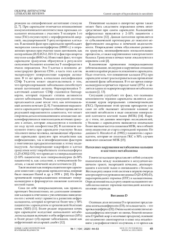 Резюме В настоящее время заболеваемость саркоидозом стремительно растет. И нередки случаи повышения кальция, на которые в современных клинических реалиях уделяется недостаточно внимания. Патология кальциевого обмена при этом заболевании имеет многосоставной характер и может не только усугубить состояние пациента, но и определить степень активности заболевания. В нашей статье рассмотрены основные звенья патогенеза нарушений обмена кальция при саркоидозе, так же нарушение функции почек, которые могут возникнуть вследствие данной патологии. Уделено внимание изменениям костного метаболизма у пациентов с саркоидозом как таковым (особенно на фоне терапии глюкокортикоидами), так и сформированными в результате длительно некомпенсированной гиперкальциемии. Также представлен алгоритм обследования пациента с гиперкальциемией при саркоидозе и обозначены пути коррекции изменений метаболизма кальция.