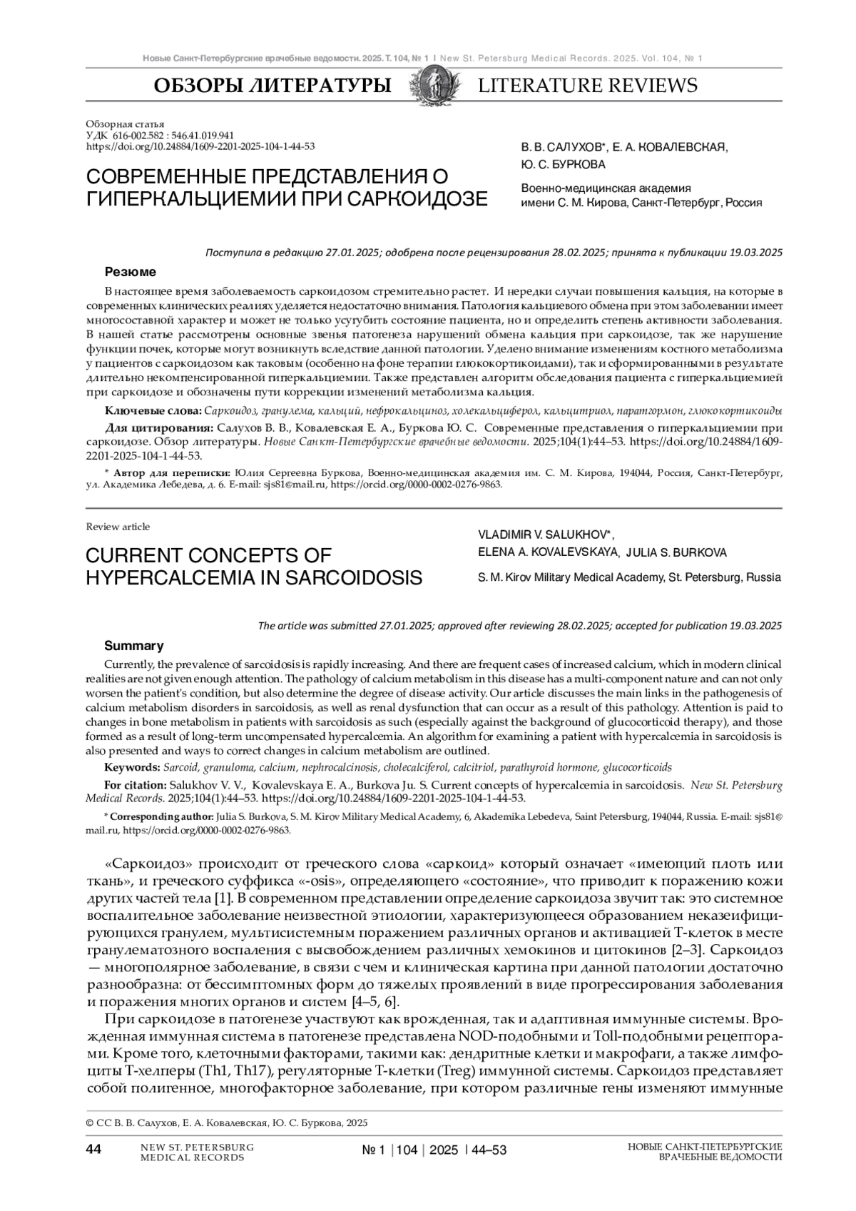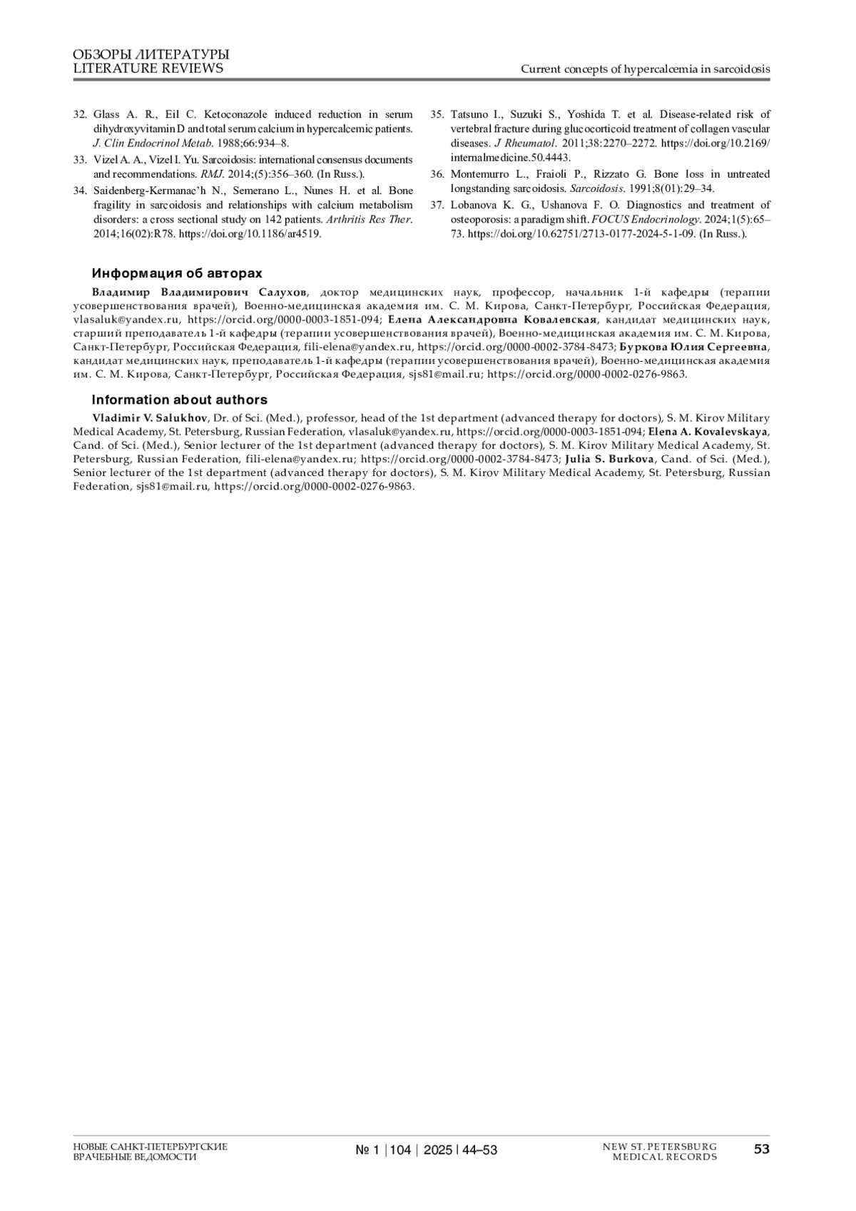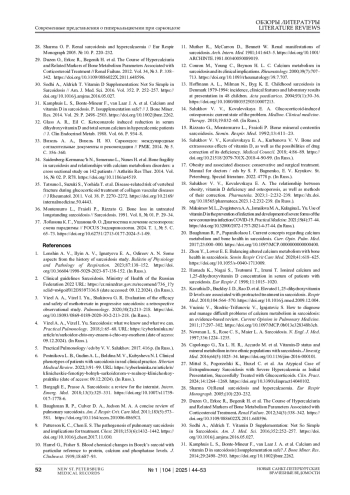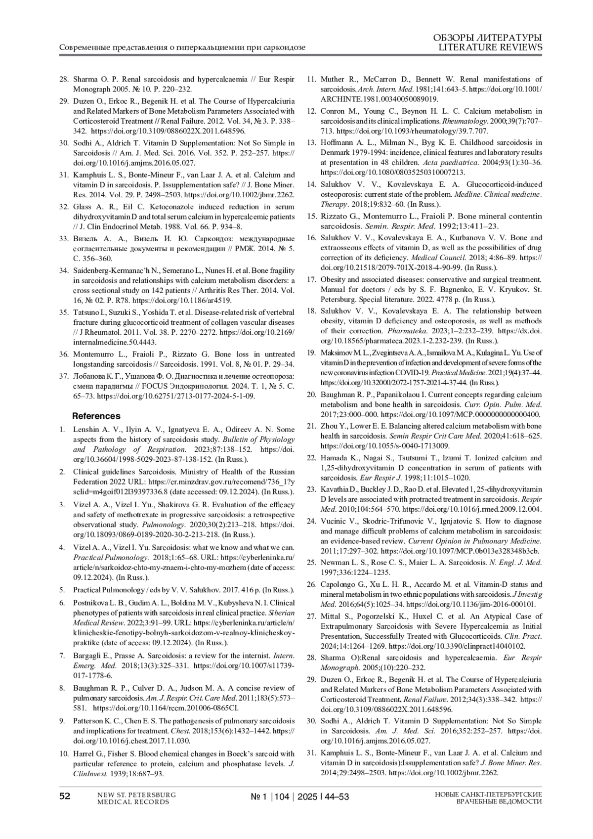 24. 	Vucinic V., Skodric-Trifunovic V., Ignjatovic S. How to diagnose and manage difÏcult problems of calcium metabolism in sarcoidosis: an evidence-based review // Current Opinion in Pulmonary Medicine. 2011. Vol. 17. P. 297-302. DOI: 10.1097/MCP.0b013e328348b3cb