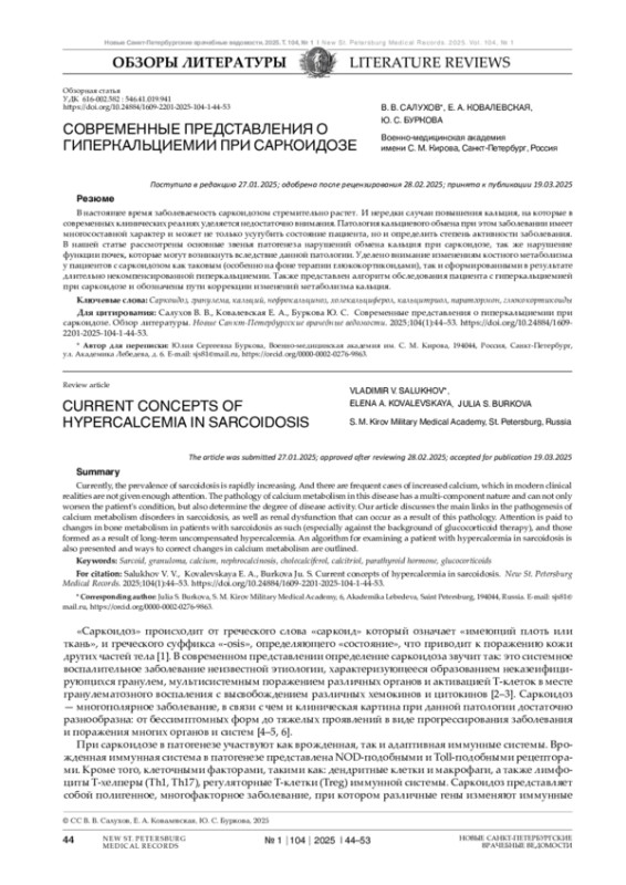 27. 	Mittal S., Pogorzelski K., Huxel C. et al. An Atypical Case of Extrapulmonary Sarcoidosis with Severe Hypercalcemia as Initial Presentation, Successfully Treated with Glucocorticoids // Clin. Pract. 2024. Vol. 14. P. 1264-1269. DOI: 10.3390/clinpract14040102