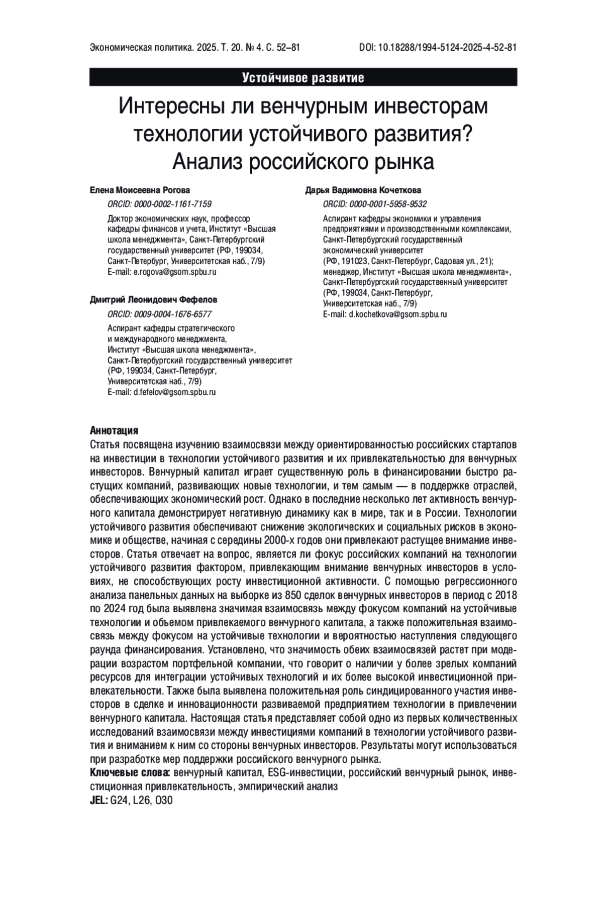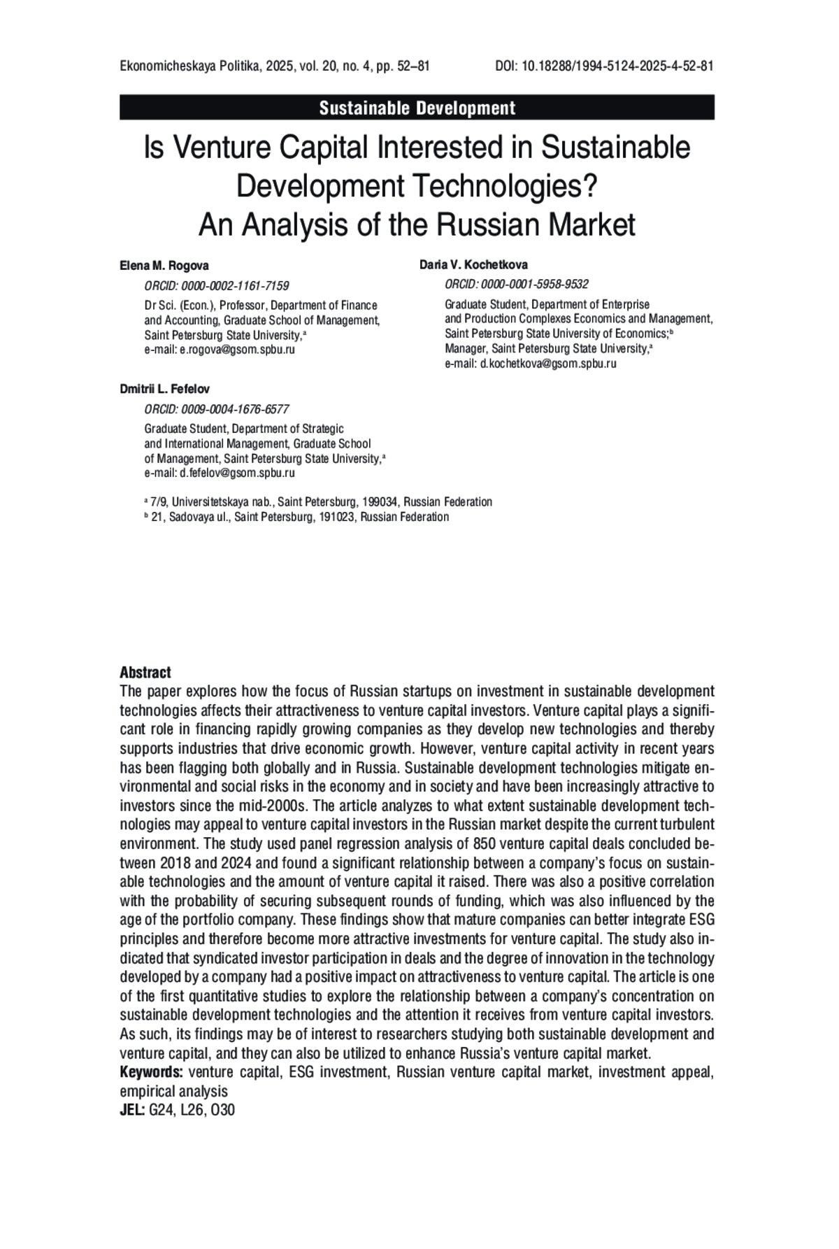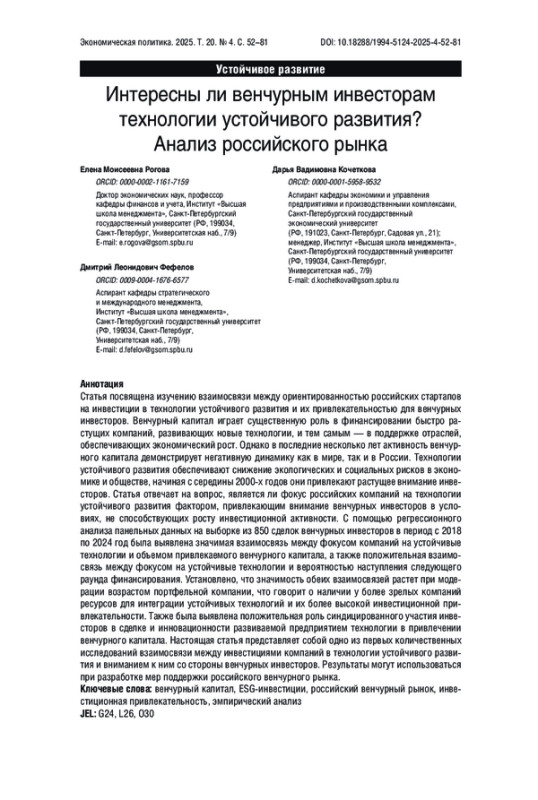 Статья посвящена изучению взаимосвязи между ориентированностью российских стартапов на инвестиции в технологии устойчивого развития и их привлекательностью для венчурных инвесторов. Венчурный капитал играет существенную роль в финансировании быстро растущих компаний, развивающих новые технологии, и тем самым — в поддержке отраслей, обеспечивающих экономический рост. Однако в последние несколько лет активность венчурного капитала демонстрирует негативную динамику как в мире, так и в России. Технологии устойчивого развития обеспечивают снижение экологических и социальных рисков в экономике и обществе, начиная с середины 2000-х годов они привлекают растущее внимание инвесторов. Статья отвечает на вопрос, является ли фокус российских компаний на технологии устойчивого развития фактором, привлекающим внимание венчурных инвесторов в условиях, не способствующих росту инвестиционной активности. С помощью регрессионного анализа панельных данных на выборке из 850 сделок венчурных инвесторов в период с 2018 по 2024 год была выявлена значимая взаимосвязь между фокусом компаний на устойчивые технологии и объемом привлекаемого венчурного капитала, а также положительная взаимосвязь между фокусом на устойчивые технологии и вероятностью наступления следующего раунда финансирования. Установлено, что значимость обеих взаимосвязей растет при модерации возрастом портфельной компании, что говорит о наличии у более зрелых компаний ресурсов для интеграции устойчивых технологий и их более высокой инвестиционной привлекательности. Также была выявлена положительная роль синдицированного участия инвесторов в сделке и инновационности развиваемой предприятием технологии в привлечении венчурного капитала. Настоящая статья представляет собой одно из первых количественных исследований взаимосвязи между инвестициями компаний в технологии устойчивого развития и вниманием к ним со стороны венчурных инвесторов. Результаты могут использоваться при разработке мер поддержки российского венчурного рынка.