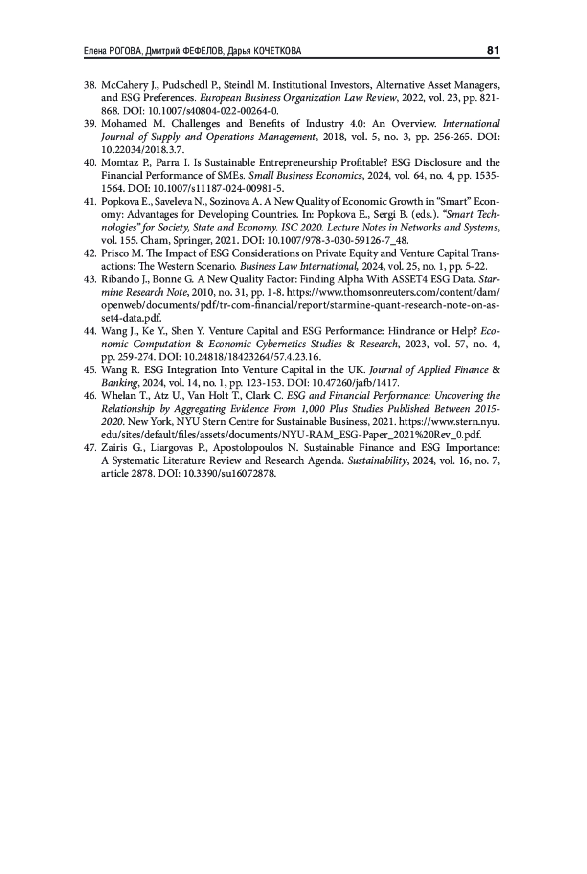 42. Prisco M. The Impact of ESG Considerations on Private Equity and Venture Capital Transactions: The Western Scenario // Business Law International. 2024. Vol. 25. No 1. P. 5-22.